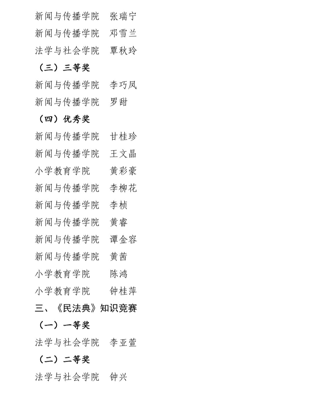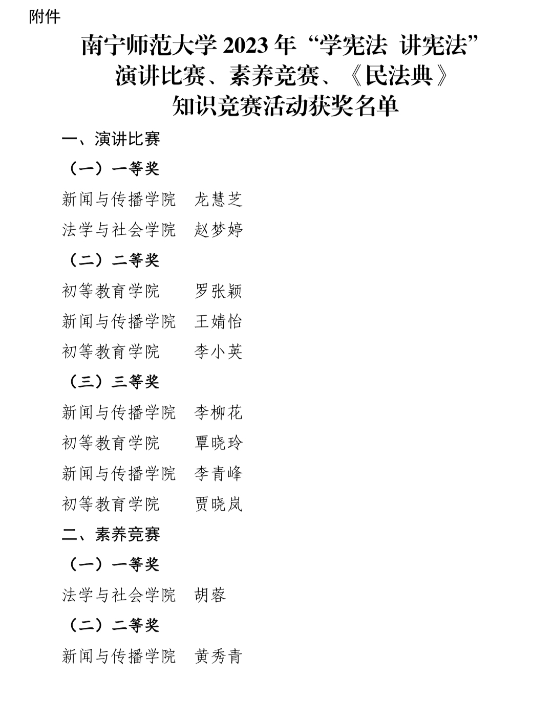 活动分为演讲比赛、素养竞赛、《民法典》知识竞赛三个项目,经过激烈的角逐,演讲比赛中,学院龙慧芝同学获一等奖,王婧怡同学获二等奖,李柳花、李青峰同学获三等奖;素养竞赛中,黄秀青等3位同学获二等奖,李巧凤等2位同学获三等奖,甘桂珍等7名同学获优秀奖;《民法典》知识竞赛中,邓雪兰等3位同学获三等奖,李巧凤等5位同学获优秀奖。