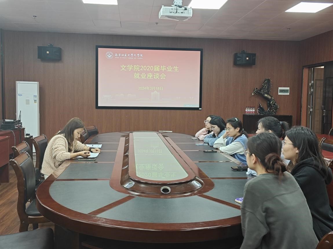 为进一步了解学生就业意向与就业情况,稳步推进2024届毕业生就业工作,文学院于3月18日在五合校区理楼404会议室召开了2024届就业座谈会。2020级汉一班班主任梁晗昱老师、辅导员罗茜老师,兼职辅导员黄海婵以及2024届部分学生通过线下和线上相结合的形式参与了此次就业座谈会。