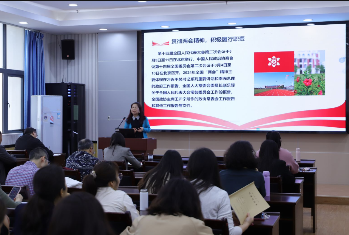 本次政治理论学习会的主题是由学院党委庞芳书记主讲的“深入学习贯彻2024年全国两会精神”。庞芳书记以今年全国两会为出发点,带领全体教职工深入学习了两会精神以及习近平总书记全国两会重要讲话精神。
