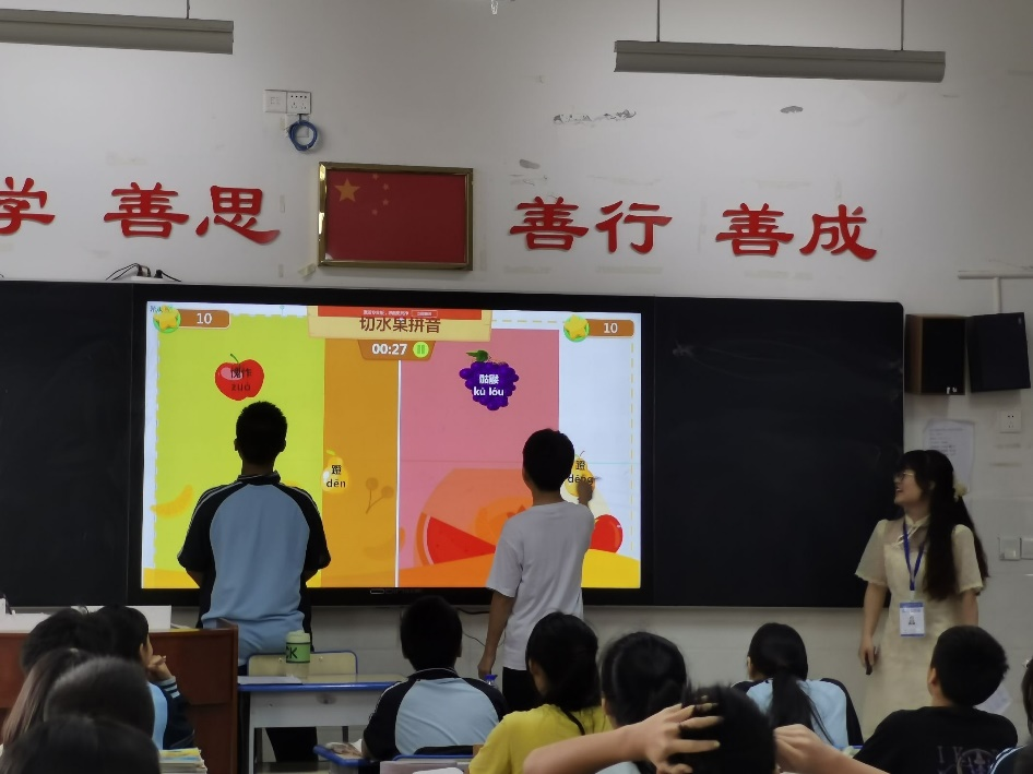 本次语文公开课是由实习生卢静执教,主题是"小人物,大情怀"。卢静以微视频创设情境,营造了浓厚的学习氛围。卢静通过设计三个学习任务,在课堂上带领学生分析人物、对比人物、读懂文章。卢静的课堂教学形式多样,比如通过切水果记拼音,连连看认识生字,小记者的互相提问等,真正让学生们成为课堂的主人,学生积极主动回答问题,踊跃举手发言,有乐趣有收获。在听课的过程中,陶班实习生用心观摩教师的教学方法,观察学生的学习状态,师生互动的操作,积极思考,认真做课堂记录。