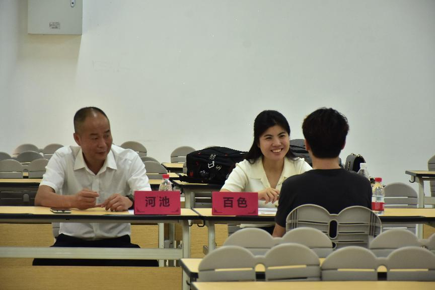 宣讲结束后,招聘会正式开始。据悉,现场共收到简历80余份。贵港、防城港、河池、来宾、梧州、贺州、百色七个地级市面试考官分别与应聘学生开展第一轮面试洽谈,部分同学进入第二轮面试。