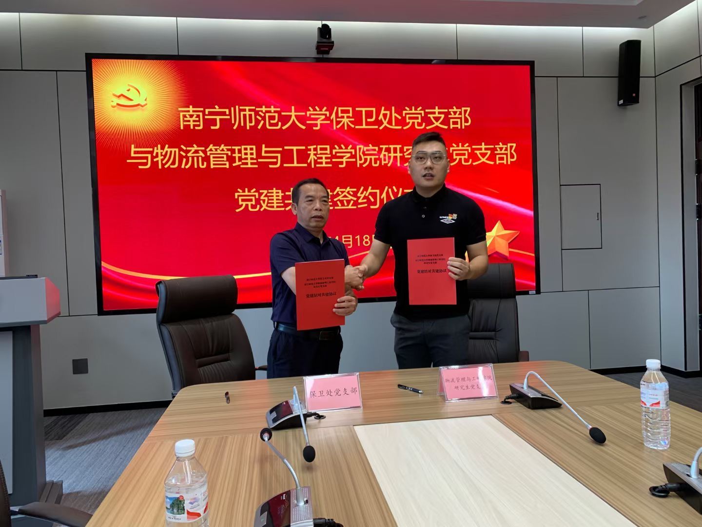 随后,物流管理与工程学院研究生党支部书记刘明炯同志与保卫处党支部书记王忠斌同志共同签订党支部党建共建协议书。