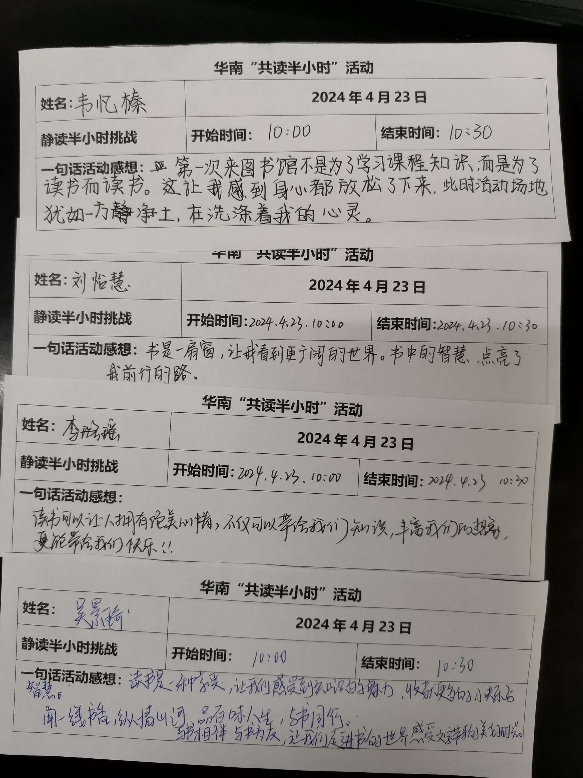 我校首次组织参与这项活动,反响热烈。在活动现场,共读师生聚精会神阅读,在书香弥漫的静读氛围中感受沉浸式纸书阅读的魅力。其中356位同学在活动现场分享了各自充满智慧和思考的阅读感悟,表达了此次共读活动回归书海、丰富自我的阅读体验。陈瑶同学分享道:“读书,是用最低廉的成本走最高级的人生路,静下心来阅读,是提升自我最直接的方式之一。”梁静同学表示:“读书,以修身,以养性。静下心来品读书籍,感觉生活都变得温柔了。”后续,图书馆将继续积极探索创新,开展更多丰富多彩的读书活动,引领阅读新风尚,充分发挥图书馆阅读主阵地的育人作用。