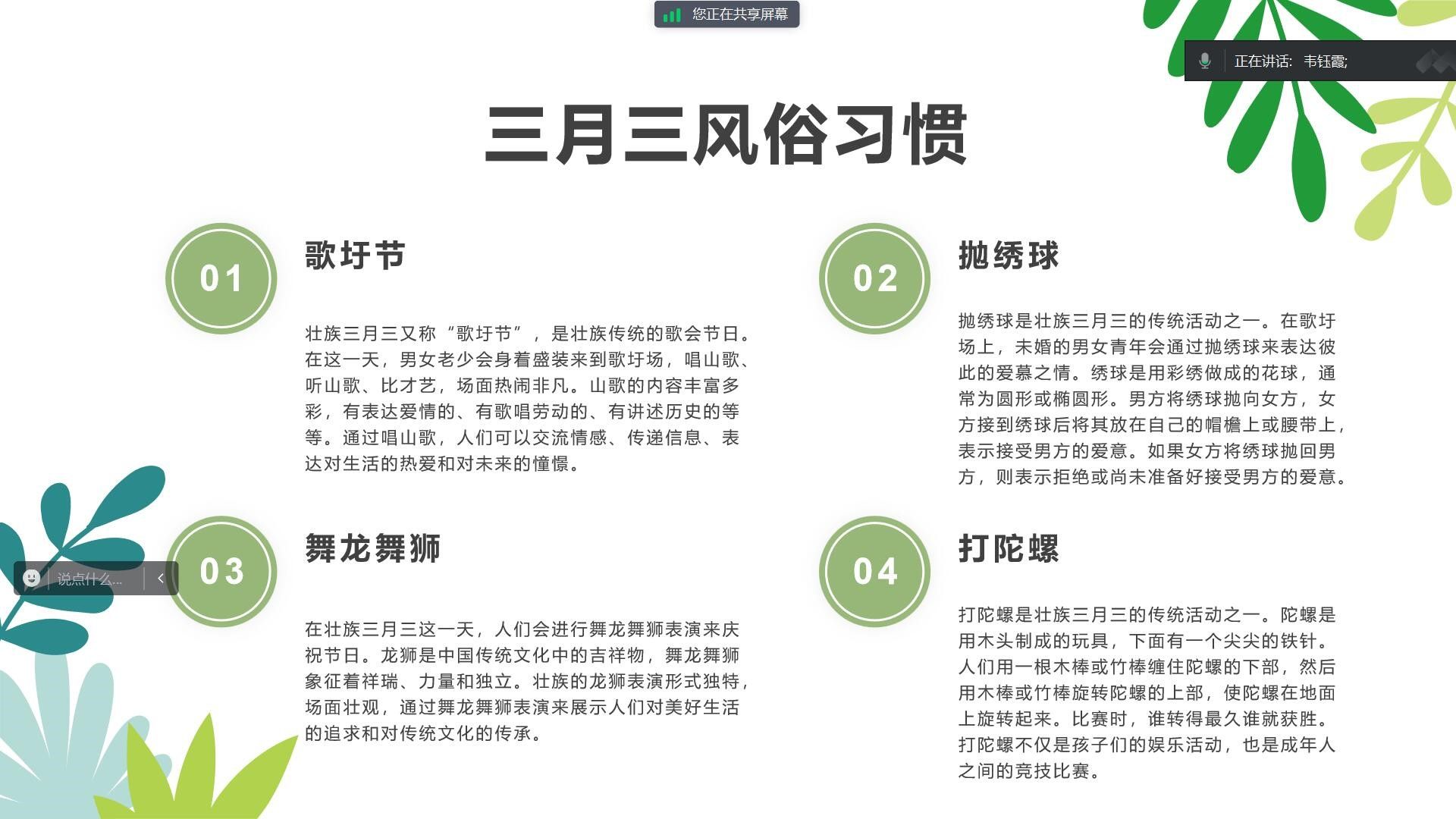 4月9日-18日,学院各班级结合实际情况充分利用线上、线下等方式开展主题班会,让民族教育走进班会课,宣传覆盖人次多达900余人。结合“三月三”的民族特性、传统特色活动等,各班积极宣传了“三月三”壮族传统节日的来历及内涵、山歌的表达方式、五色糯米饭是如何制作而成等民族文化知识,个别班级也采用了猜谜语、民族知识竞答、对唱山歌等形式来进一步了解“三月三”节日的民族内涵。通过这些活动,不仅让师生们懂得更多的壮族传统文化知识、了解了祖国的多元文化,也增强了热爱祖国、热爱家乡的热情。