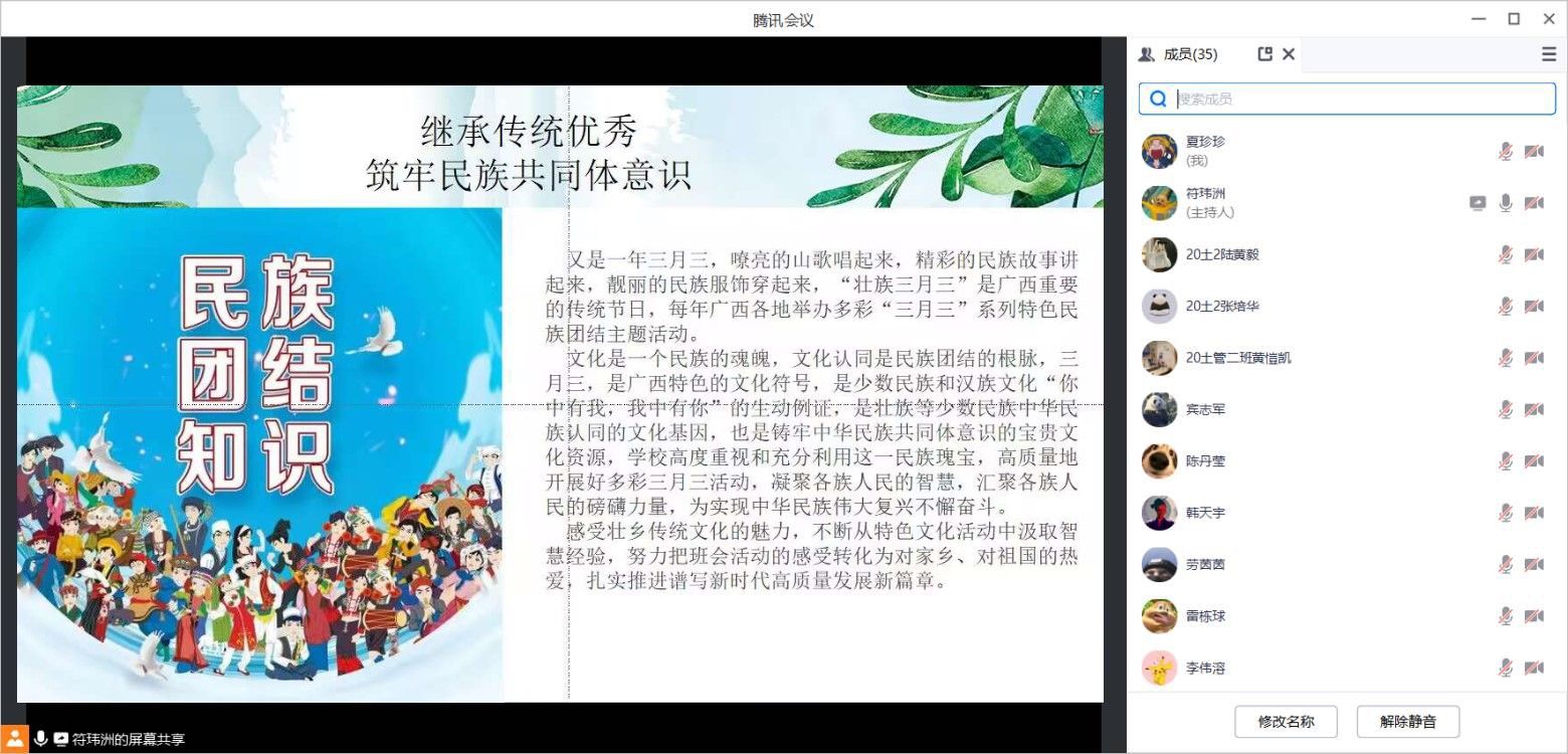 为铸牢中华民族共同体意识,弘扬优秀传统民族文化,凝聚各民族情谊,营造校社共育、共乐的良好氛围,近日,学院各班级开展了2024年“广西三月三”民族团结进步宣传月主题班会。