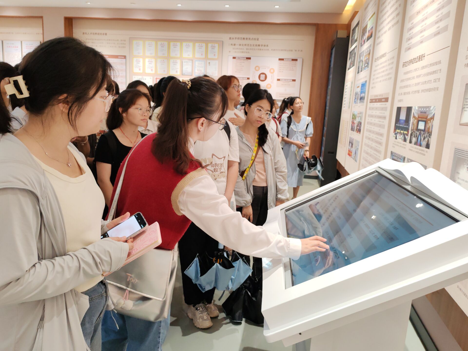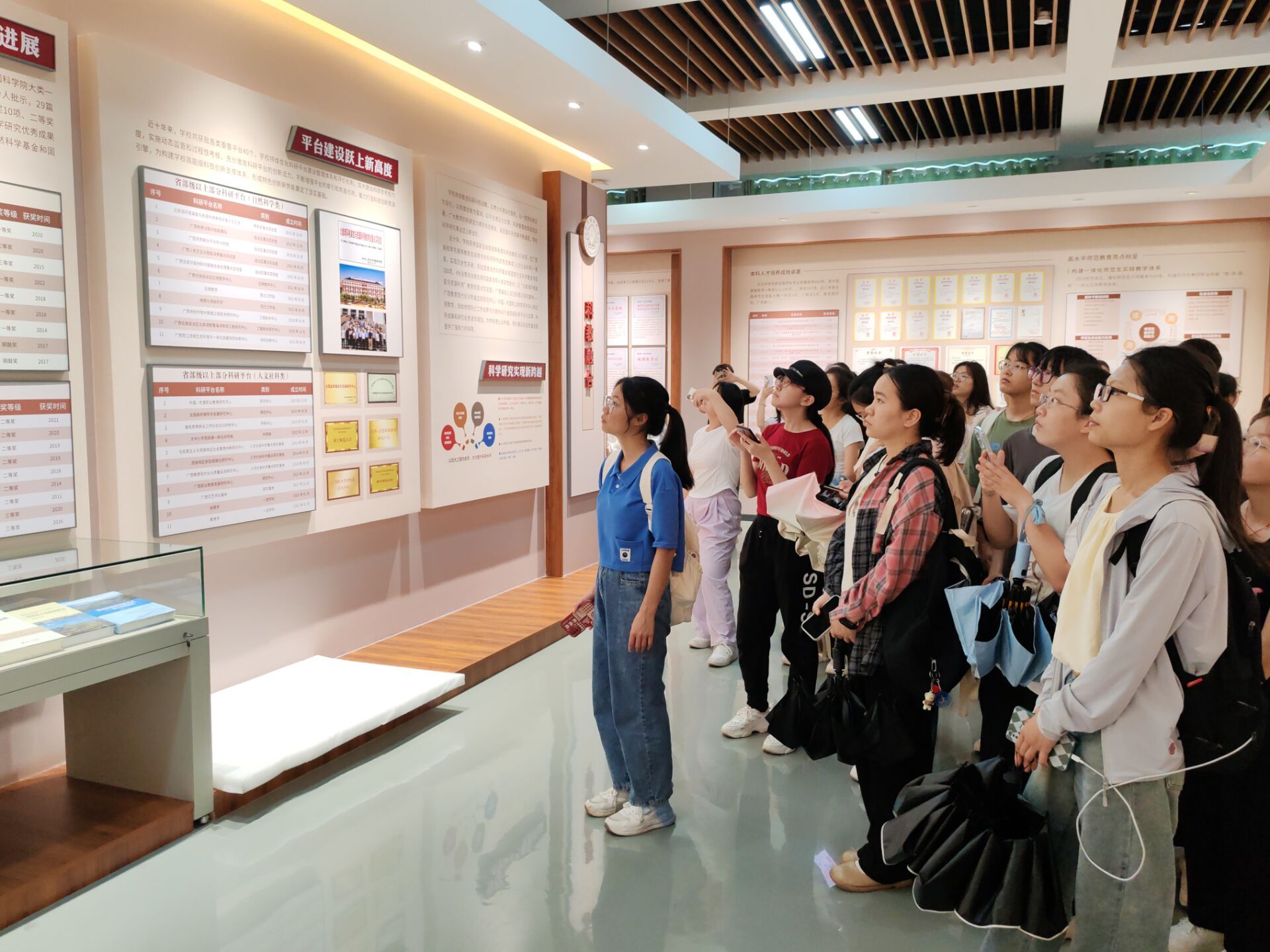 同学们在讲解员的带领下参观了七秩风华展厅、春华秋实展厅和特色专题展厅,了解到了完美(中国)七十年的发展历程,目睹了完美(中国)在人才培养、科学研究、社会服务、文化传承创新、国际交流合作等方面取得的突出成果。