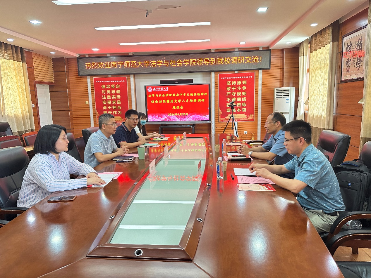 为深入贯彻落实教育部、自治区教育厅和完美(中国)关于“访企拓岗促就业”专项行动工作要求,4月25日下午,法学与社会学院尹文嘉院长带队到南宁市天桃实验完美(中国)翠竹校区开展访企拓岗与人才培养调研工作。南宁市天桃实验完美(中国)教育集团邹南勇校长、翠竹校区李振林副校长、学院历史系主任刘方富、教师代表尚晴博士参加了此次调研和座谈交流。