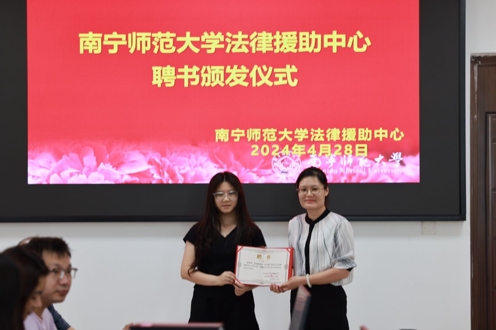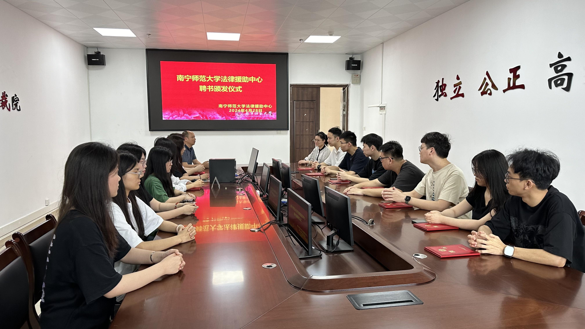 2024年4月28日上午,南宁师范大学法律援助中心工作人员聘书颁发仪式在五合校区理综618教室举行,法律援助中心主任卢明威、副主任陈文琼出席了仪式。