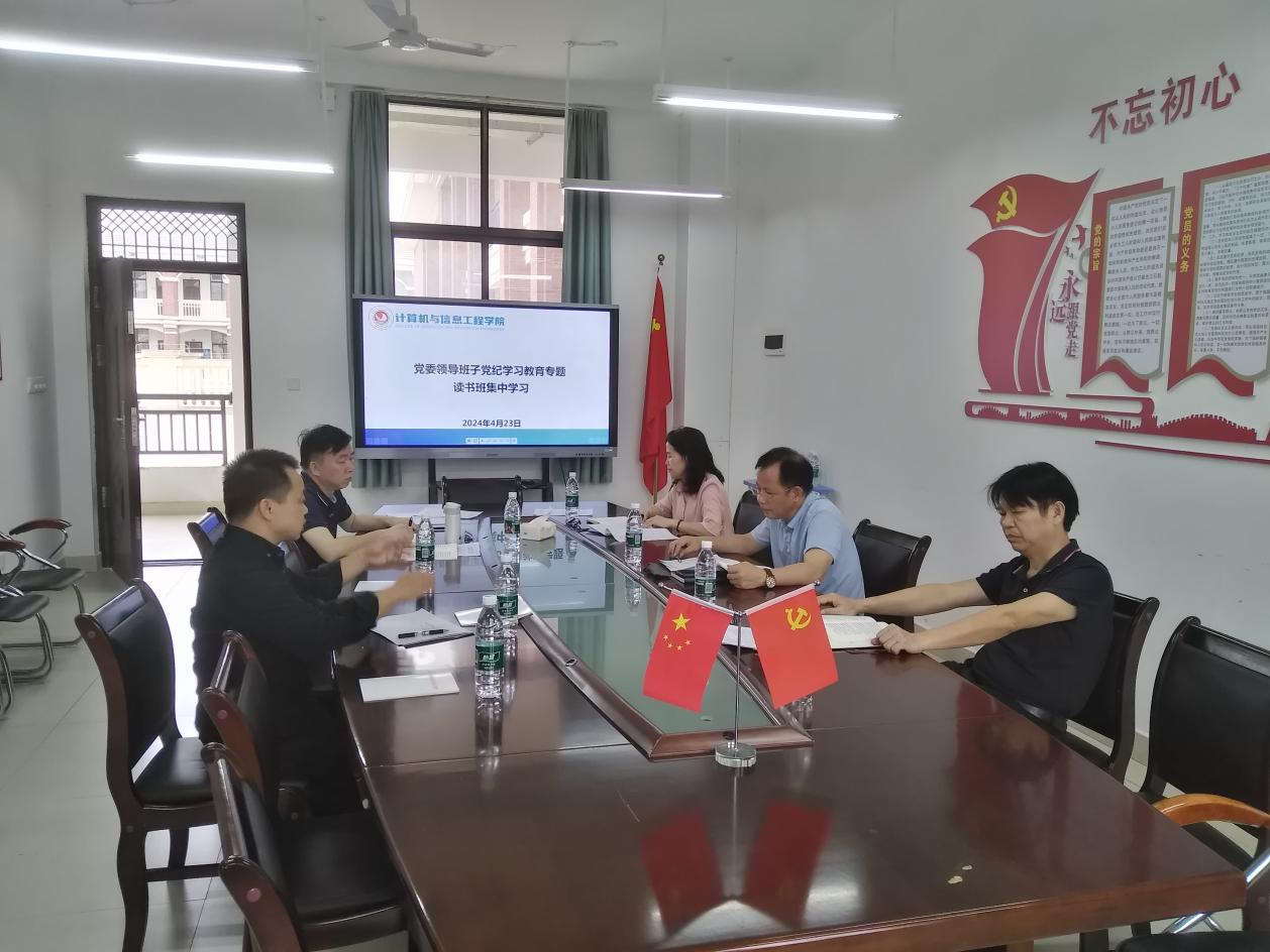 4月23日,计算机与信息工程学院党委领导班子在武鸣校区地信楼A302教室举行党纪学习教育专题读书班开班式暨第一次集中学习,学院全体领导班子成员参加会议。会议由学院党委书记余朝文主持。