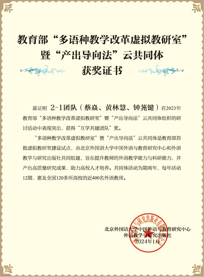 教育部首批虚拟教研室建设试点“多语种教学改革虚拟教研室”由北京外国语大学牵头组建,以文秋芳教授及其领导的促研团队为带领,吸引了全国众多高校外语教师团队积极申报。2022年初,经过严格审核与选拔,最终来自128所高校的教师团队获得参与资格,成员中教授职称、博士学历、国内外在读博士生比例高,是目前国内规模最大、影响最广的外语教研虚拟共同体。在外国语学院领导的大力支持下,蔡焱、黄林慧、钟荛键三位教师组队申报,成为首批获得参与资格的团队。