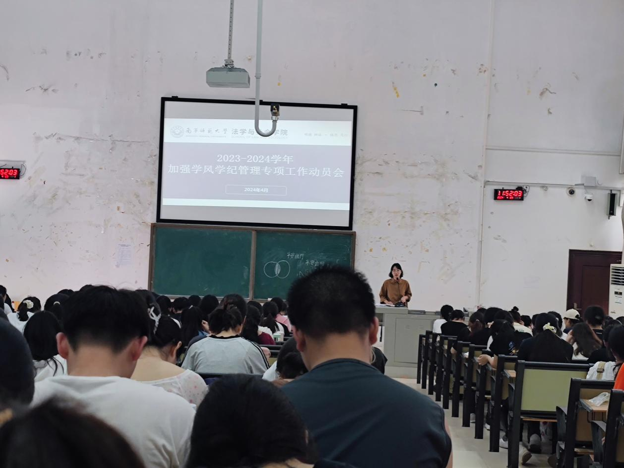 三是开展学风建设专项整治活动。学院为持续深化优良学风建设,提高学生学习的积极性和主动性,促进学生全面发展、综合素质全面提升,本着营造浓厚的学习氛围,形成良好班风、学风的目的,开展2024年学风建设专项整治活动,召开迎评促建“学风建设”专题座谈会,制定并下发了《法学与社会学院关于进一步加强学风学纪管理的通知》,举办了学风教育主题大会。年级辅导员、各班班长、团支部书记、学生会干部带头,全员覆盖。强化学风建设的重要性,呼吁全体学生共同营造良好的学习氛围,以此创造“以教育立学风、以榜样促学风、以管理治学风”的氛围,团结一心,共同建设秩序井然、充满活力、乐学勤学的优良学风。