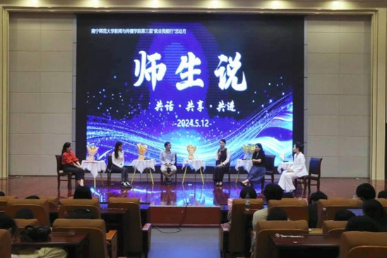 5月12日19时,新闻与传播学院于文综楼114报告厅开展“师生说”访谈会。这次访谈邀请了两名教师——新闻系主任林秀梅,广电系主任陈秋凌,和三名毕业生代表——2012届广播电视新闻学何汉立,2014届播音与主持艺术专业黄莹以及2022届新闻与传播专业蒋莉。