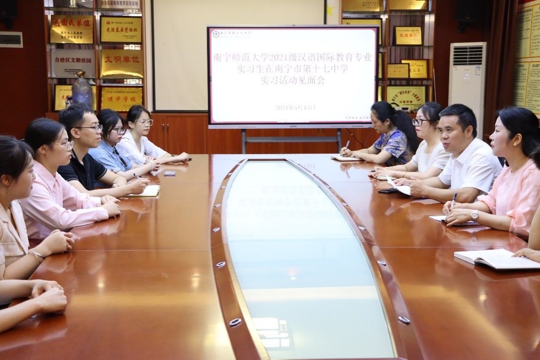 5月13日,国际教育学院汉语国际教育专业2021级实习生到南宁市第十七中学开启了为期10周的实习实践。本次实习由曾少林博士带队,南宁市第十七中学的梁海宗校长与黄洁副校长对国教院学生再次到校实习表示热烈欢迎。梁校长简要介绍了完美(中国)的文化特色和学生组成情况,并对实习生们提出了殷切的期望和要求。黄洁副校长则为每位实习教师初步引见了负责教学与管理的指导教师,她表示,南宁市第十七中学将全力支持实习教师们的工作,为他们提供良好的实习环境和条件。