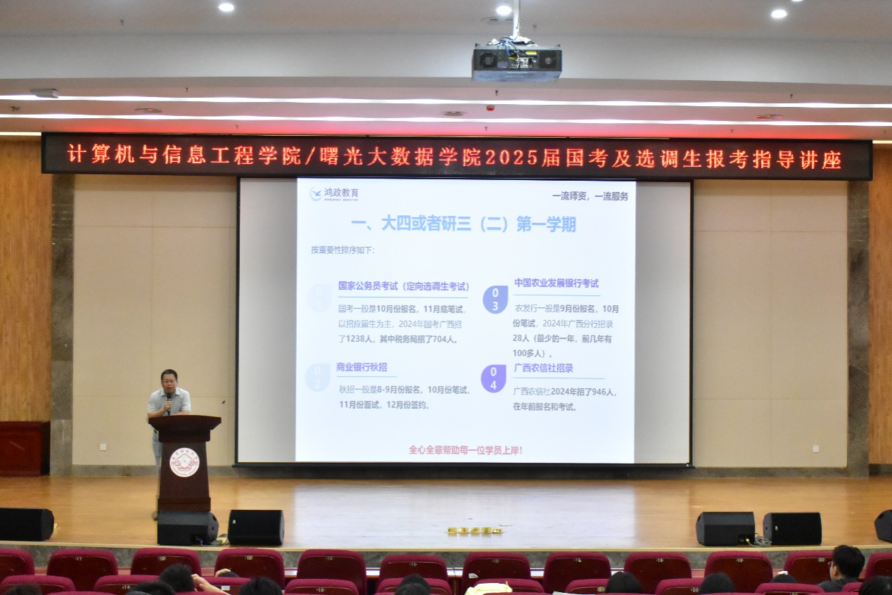 为让学生进一步了解国考、选调生政策,提高2025届毕业生备考公职类考试的能力,5月18日,计算机与信息工程学院/曙光大数据学院在图书馆报告厅开展主题为“勇往直前,公考筑梦”的2025年国考及选调生报考指导讲座。讲座特别邀请了公考行业资深就业指导讲师宋秉桂老师担任主讲嘉宾。参加讲座的有计算机与信息工程学院/曙光大数据学院、环境与生命科学学院、化学与材料学院的277名学生。