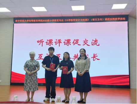 本次课程实践活动主要包含学生课堂演练、名师风采展示、小组合作研讨等。在学生课堂演练环节,同学们纷纷展示自己的教学技能和基本功,老师们依次进行点评,帮助同学们发现问题,解决问题,不断提高专业水平。在名师风采展示时,同学们聆听了南宁市凤翔路小学卢飞燕老师的现场课《荷叶圆圆》、南宁市五象新区第二实验小学张莉老师的研究课《十六年前的回忆》、南宁市五象新区第二实验小学莫烘霞书记《革命文化教育与语文教学》的讲座,南宁师大梁春莲教授《立足三个维度、彰显革命文化题材教学的特性》的讲座。在小组合作研讨环节,南宁市凤翔路小学语文团队教研组以《荷叶圆圆夏日研研乐趣融融》为主题,向同学们分享了团队研修成果,教师间积极交流,促进思维碰撞。