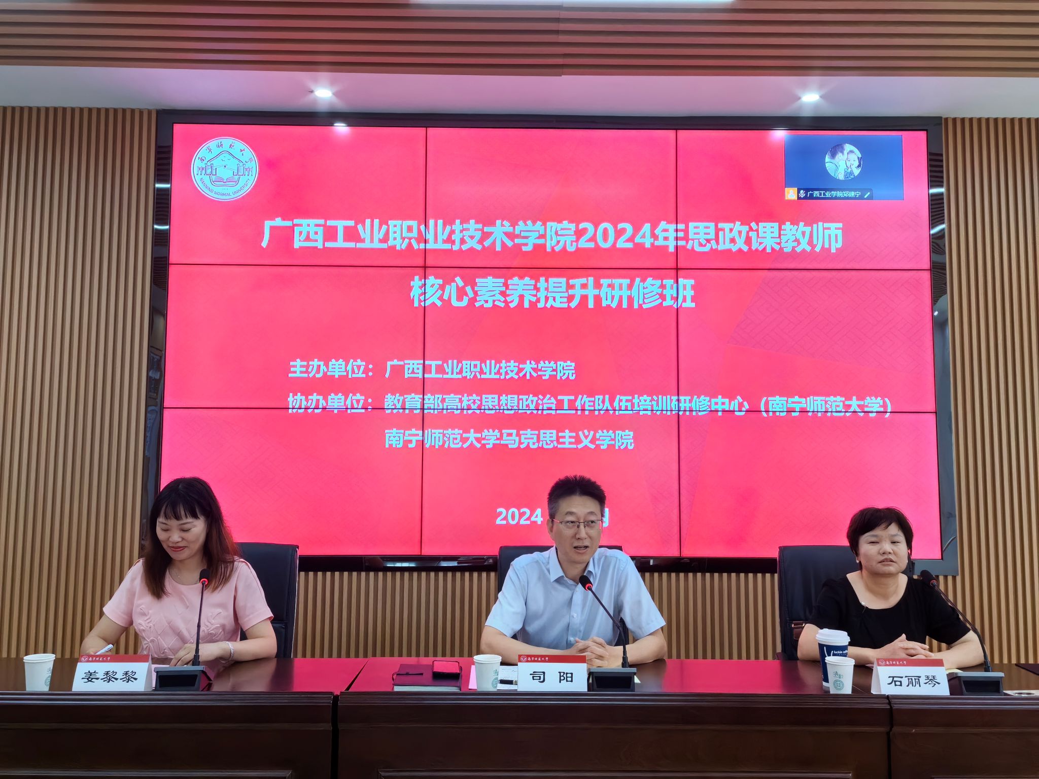 2024年5月31日,由广西工业职业技术学院主办,教育部高校思想政治工作队伍培训研修中心(南宁师范大学)及南宁师范大学马克思主义学院承办的广西工业职业技术学院2024年思政课教师核心素养提升研修班在南宁顺利举行开班仪式。来自广西工业职业技术学院43名思想政治理论课教师参加培训。广西工业职业技术学院马克思主义学院院长司阳副教授、南宁师范大学马克思主义学院副院长石丽琴教授及南宁师范大学姜黎黎老师出席了开班仪式。
