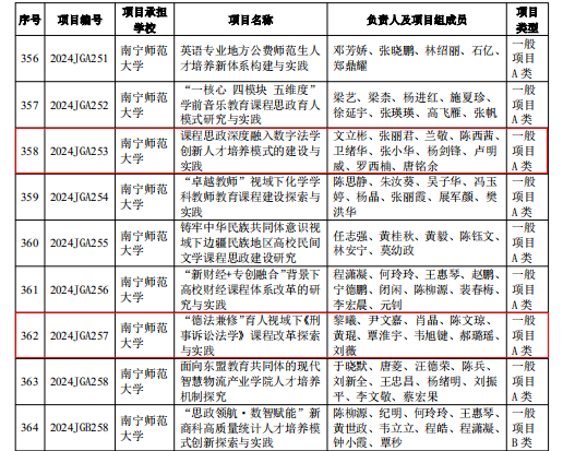 近日,广西壮族自治区教育厅印发《关于公布2024年度广西高等教育本科教学改革工程项目的通知》,法学与社会学院法律系文立彬副教授主持的“课程思政深度融入数字法学创新人才培养模式的建设与实践”、黎曦博士主持的“‘德法兼修’育人视域下《刑事诉讼法学》课程改革探索与实践”喜获自治区级教学改革工程一般项目A类立项。