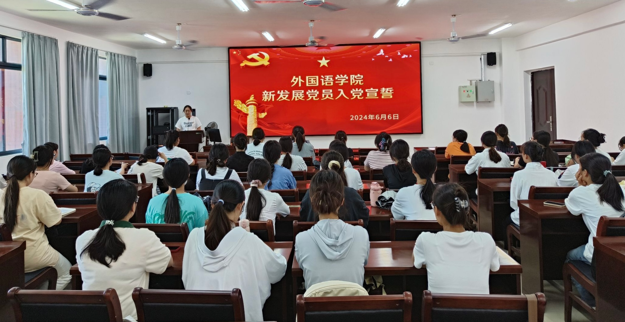 6月6日中午,外国语学院党委于武鸣校区实验楼1B-515会议室组织2024年上半年新发展预备党员宣誓。外国语学院党委组织委员蔡梓晴老师、部分正式党员以及2024年上半年新发展党员参加了本次入党宣誓仪式,仪式由陈丽同志主持。