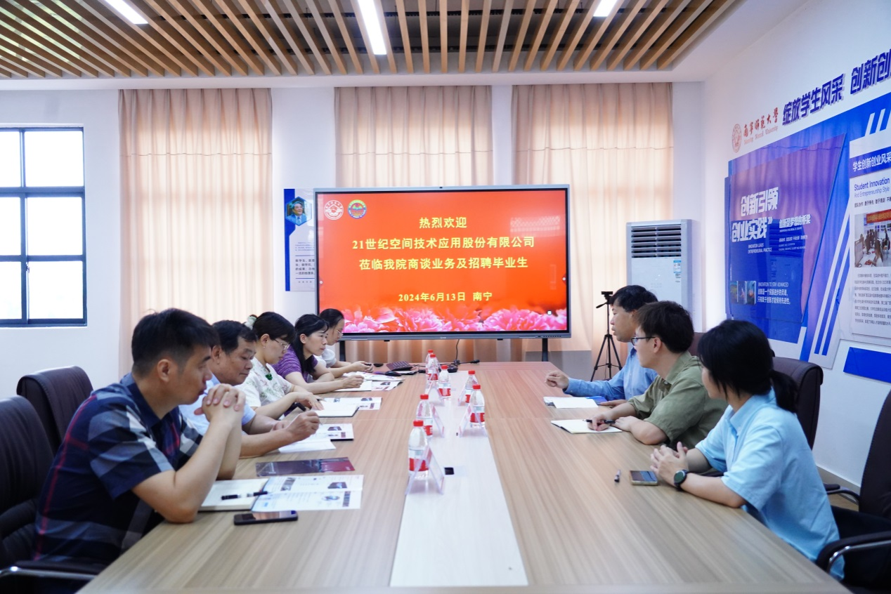 为了更好地拓宽地理科学与规划学院学生的实习及就业渠道,帮助毕业生实现充分、高质量就业,6月14日,学院邀请二十一世纪空间技术应用股份有限公司到学院宣讲招聘,南宁世纪空间技术应用有限公司市场经理王井英,广西世纪空间科教信息技术服务有限公司副总经理、星耀南宁科学馆馆长黄俊和售前技术经理黄晨琦负责此次招聘工作,学院相关领导、教师代表和应聘毕业生参加活动。