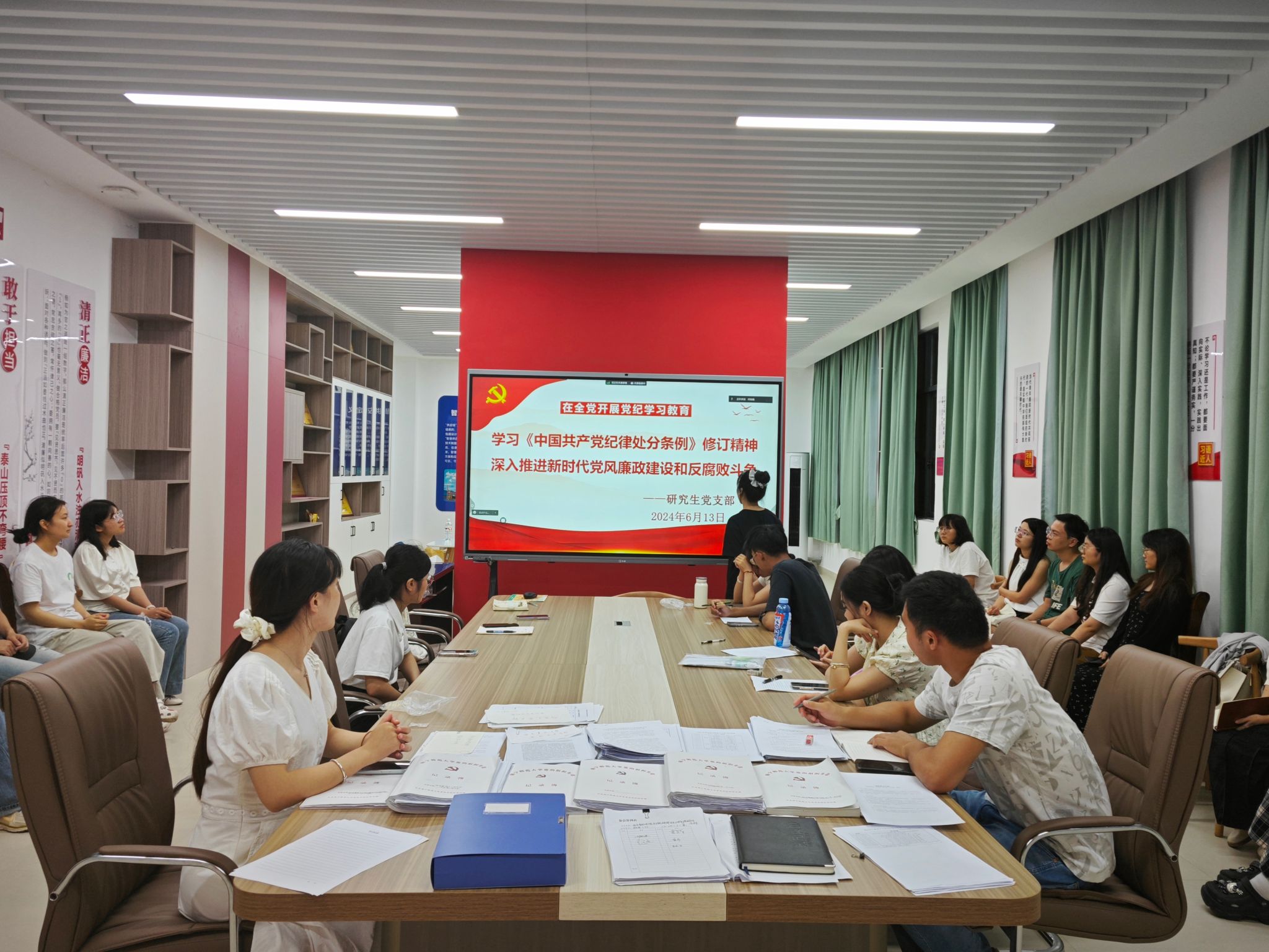 6月13日晚,物流管理与工程学院研究生党支部在武鸣校区地化楼C307党员活动室集中开展党纪学习教育的专题学习。此次专题学习的主题是“学习《中国共产党纪律处分条例》修订精神,深入推进新时代党风廉政建设和反腐败斗争”。支部全体党员参会。专题学习由支部副书记梁小平同志主持。