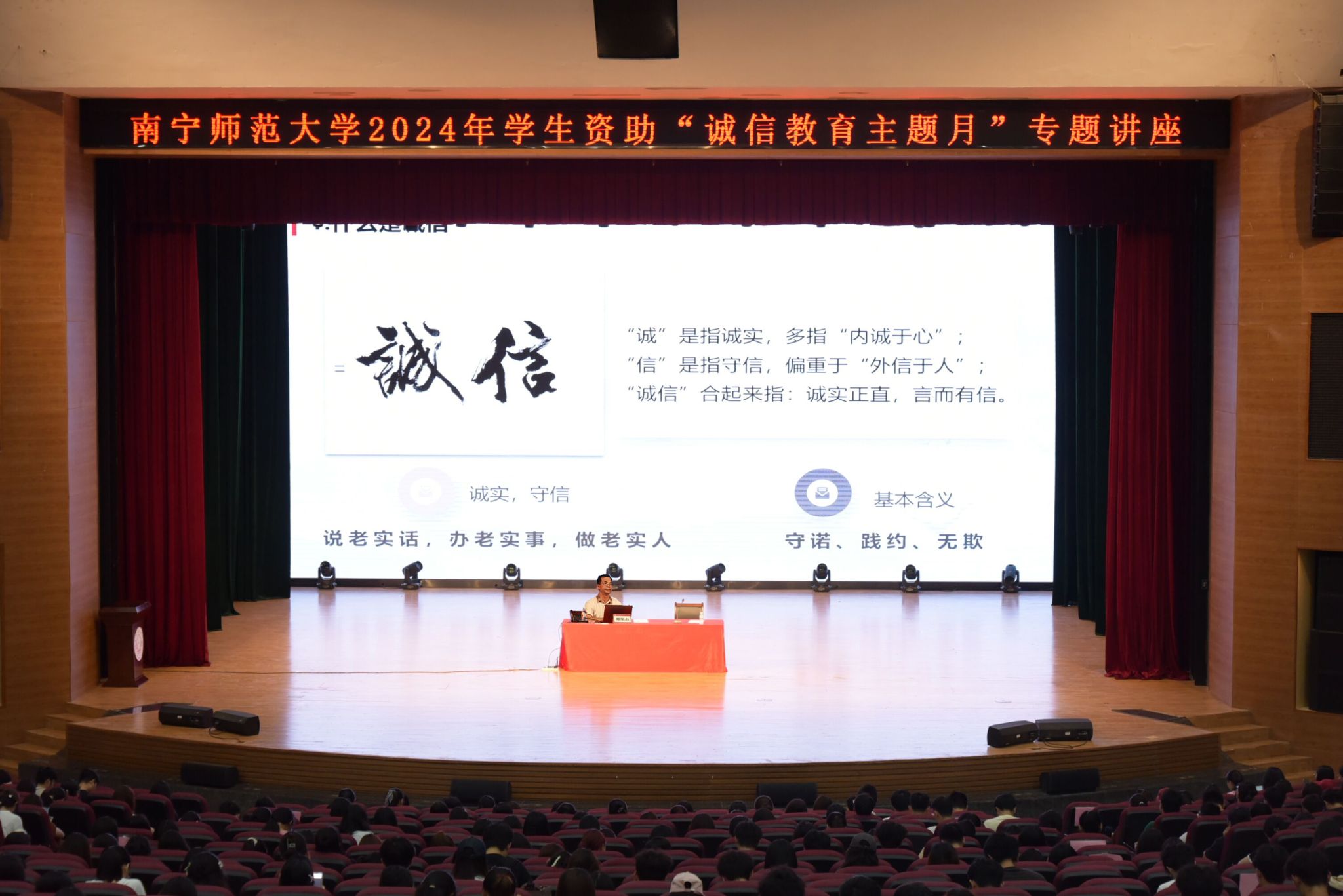 为进一步增强大学生诚实守信的责任意识,充分发挥资助育人功能,6月25日下午,我校在武鸣校区音舞楼一号报告厅举办2024年学生资助“诚信教育主题月”专题讲座。本次讲座特邀我校政策法规与发展规划处处长邓军彪主讲,讲座由我校学生工作部(处)副部(处)长林柳主持,我校学生资助中心工作人员、辅导员和近1000名学生代表参加了讲座。