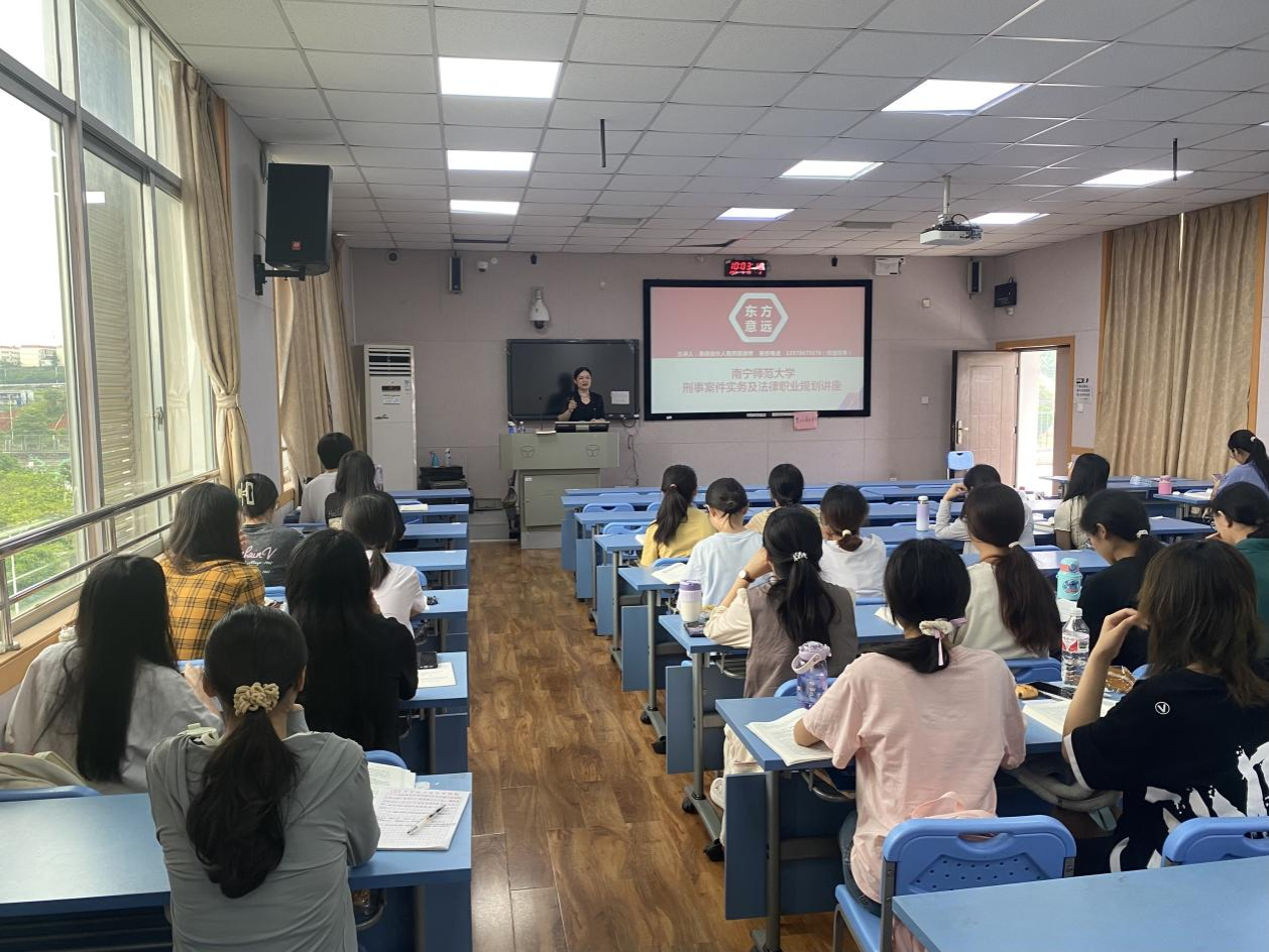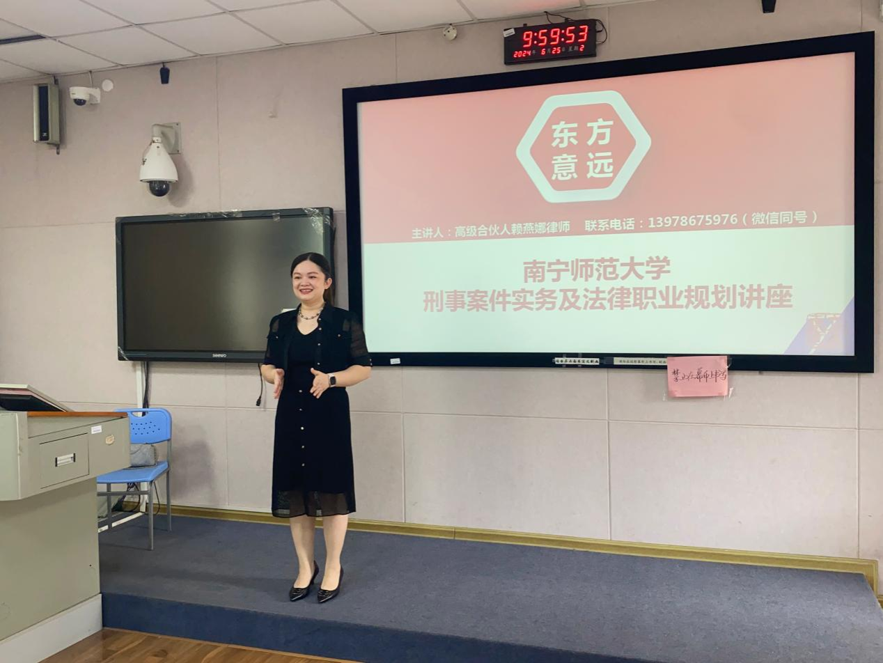 《刑法(二)》课程是法学专业核心课程、必修课程,由文立彬副教授主讲,该课程已入选南宁师范大学课程思政示范课程和教学改革示范课程。为进一步提升课堂教学成效,促使学生在接受法学教育的初级阶段塑造正确的法治核心价值观和健康的法律职业观。6月25日上午,法学与社会学院法律系课程教学团队邀请到广西东方意远律师事务所高级合伙人、婚姻家事与财富传承法律事务部部长赖燕娜律师为2023级法学1班本科生授课。