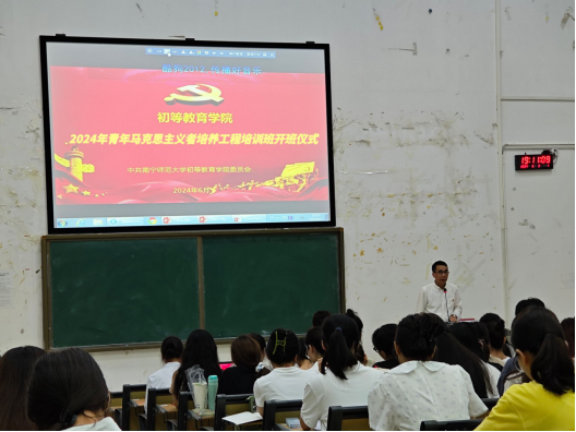 6月3日晚,初等教育学院2024年“青年马克思主义者培养工程”培训班在五合校区五综308教室举行开班仪式暨开班第一讲。学院党委书记陆以宏出席仪式并作第一讲专题培训。仪式由学院党委组织员何聪主持,学院辅导员与2024年“青马班”学员参加了仪式与培训。