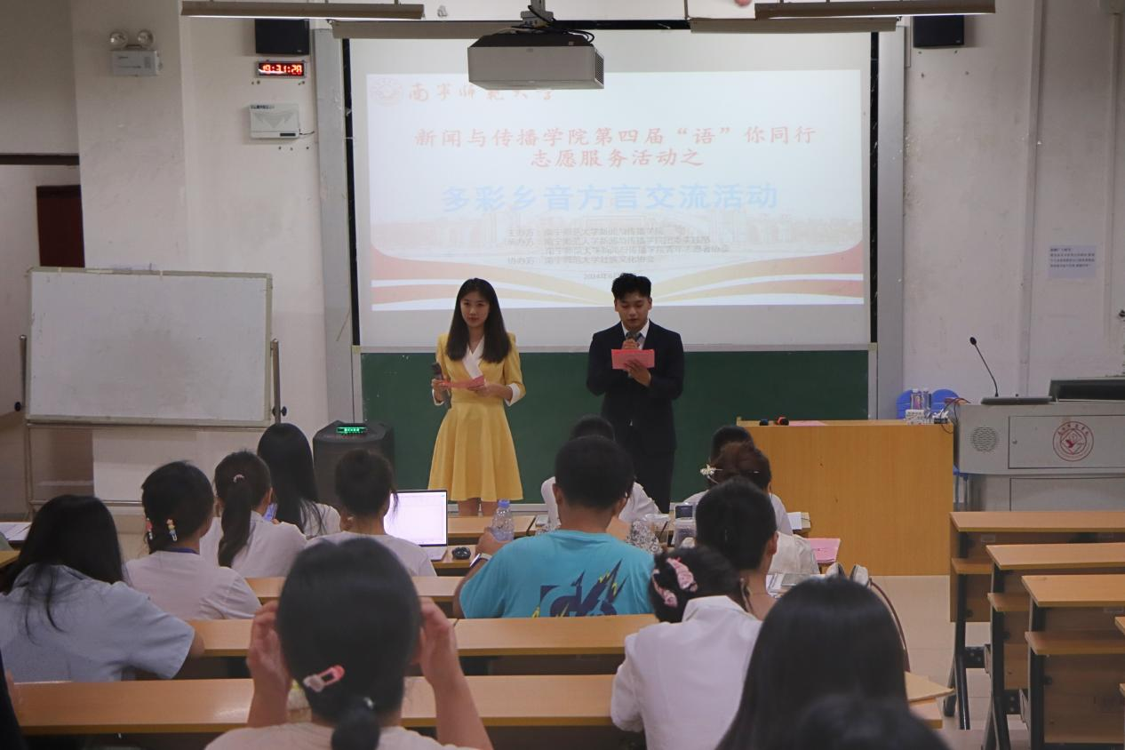 6月21日晚,文综415教室灯火通明,洋溢着浓厚的文化氛围,新闻与传播学院在这里隆重举办了第四届“语”你同行志愿服务活动之多彩乡音方言交流活动。本次活动由才华横溢的23播主2班陈照林与谢锦怡联袂主持。活动不仅吸引了本院师生的积极参与,还迎来了各兄弟学院的代表队伍,共同编织了一场方言文化的盛宴。