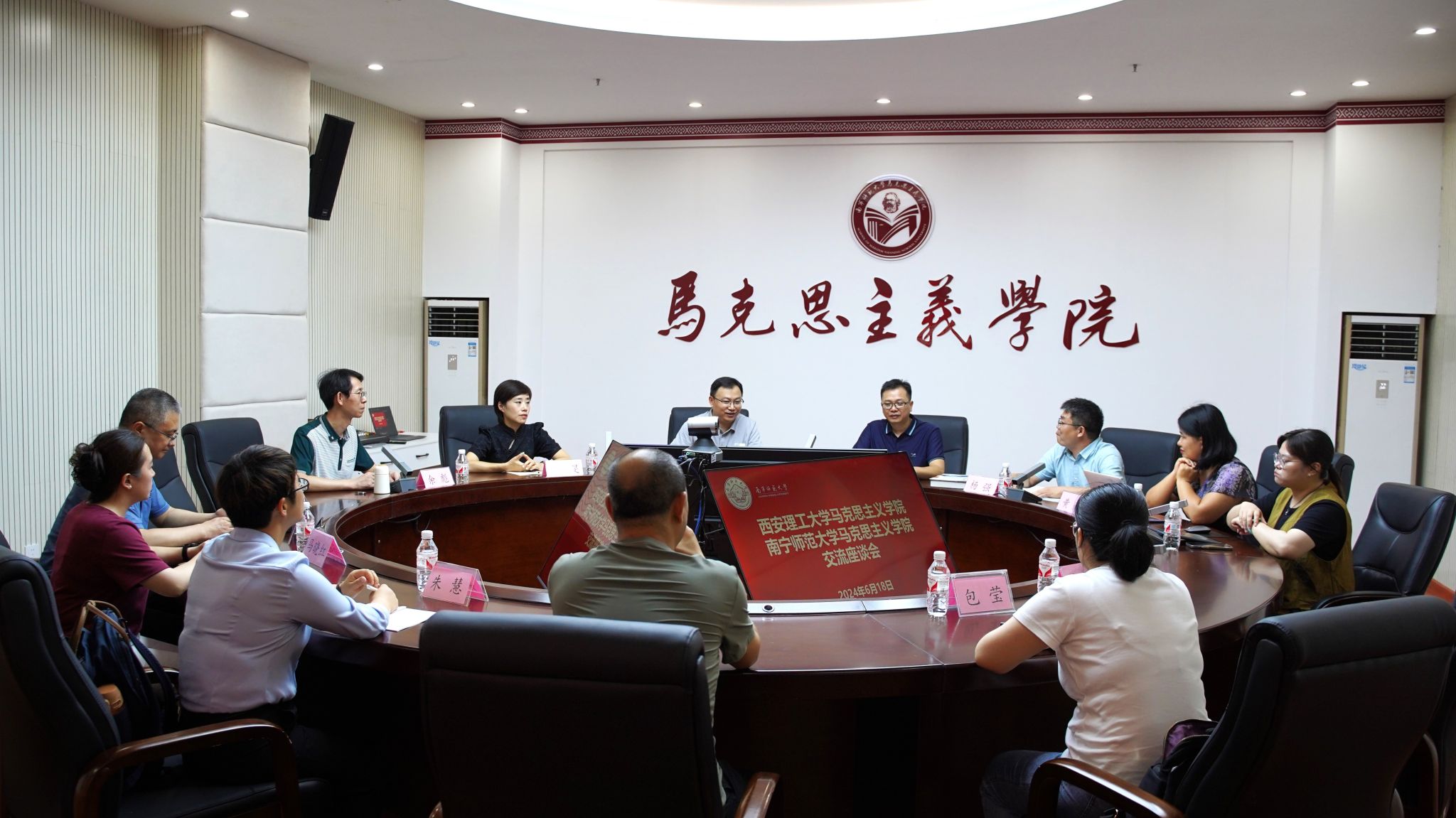 在交流会上,马克思主义学院黄志海副书记从学科建设、历史沿革、人才培养、教学科研等方面简要介绍了马克思主义学院基本状况和所取得的成果;德法教研室主任杨强讲解了马克思主义学院“三三制”教学模式的详细情况和取得的成效;实践教研室主任刘艳闽重点介绍了马克思主义学院教学数据平台建设情况。西安理工大学马克思主义学院党委副书记、副院长陈文林副教授向与会人员介绍了西安理工大学马院的发展情况,并就学科建设问题和马克思主义学院教师进行了详细交流。