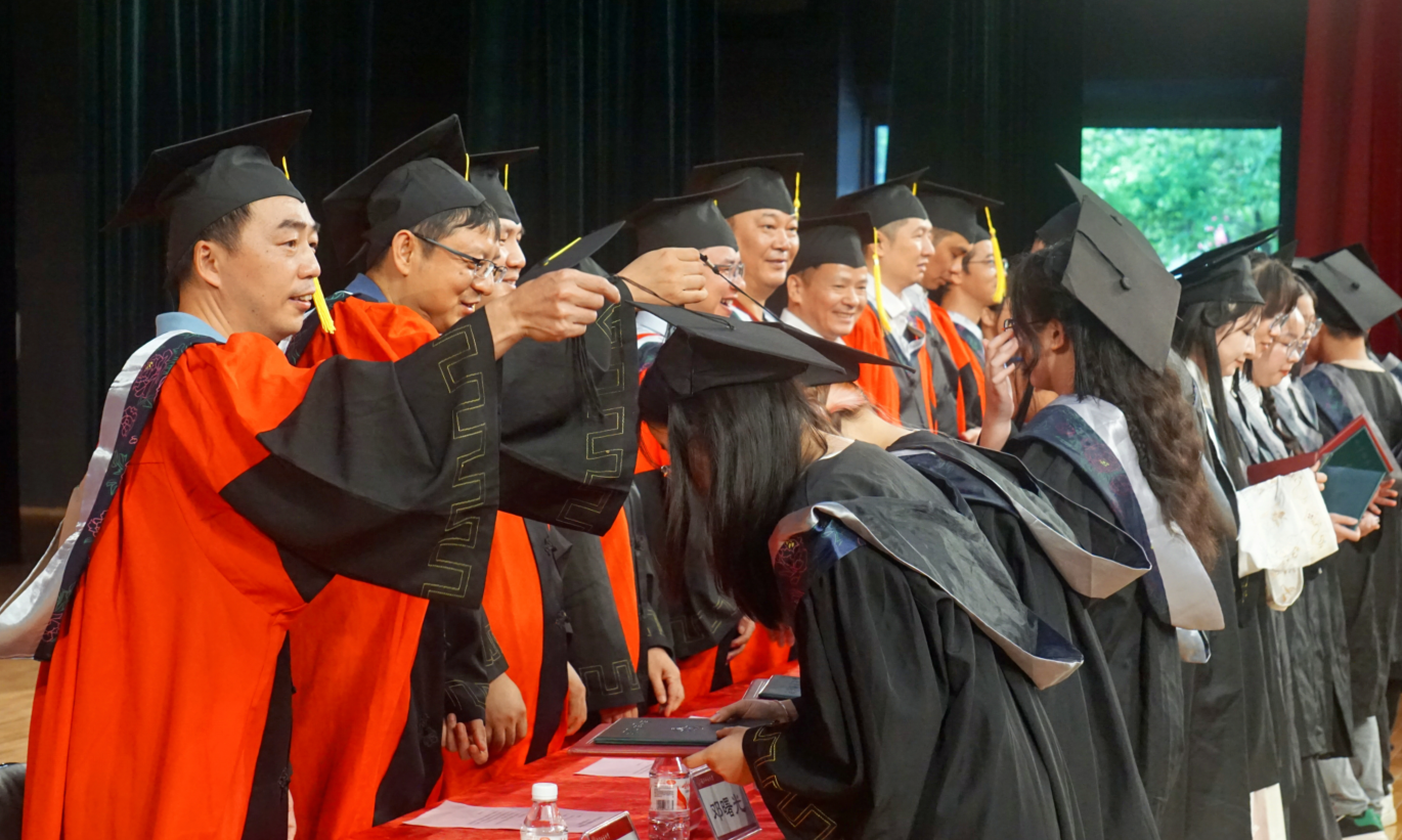 学院党委书记严志强宣读了研究生和本科生毕业和学位授予相关文件,学院副院长罗国玮宣读了区级、校级优秀毕业生表彰文件。在主席台就坐的领导、学位评定分委员会委员为毕业生颁发毕业证书和学位证书并一一拨穗。