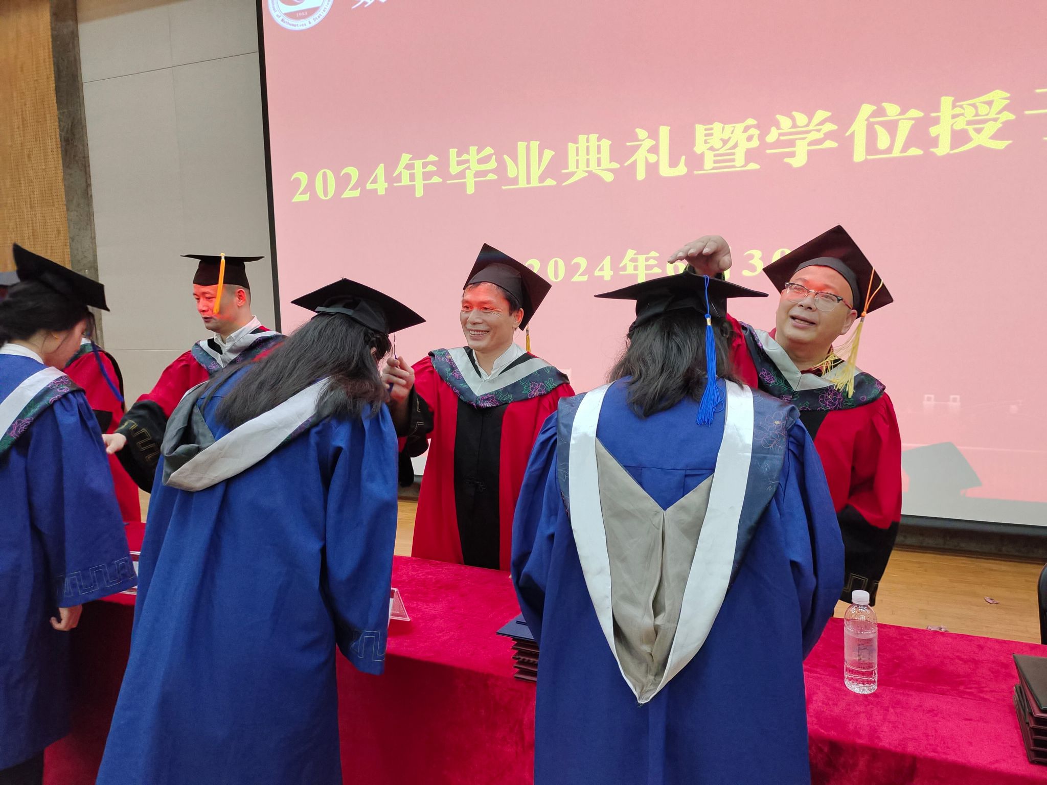 该院领导老师们为2024届全体毕业生拨穗正冠并为毕业生颁发毕业证书、学位证书,场面庄重而温馨。