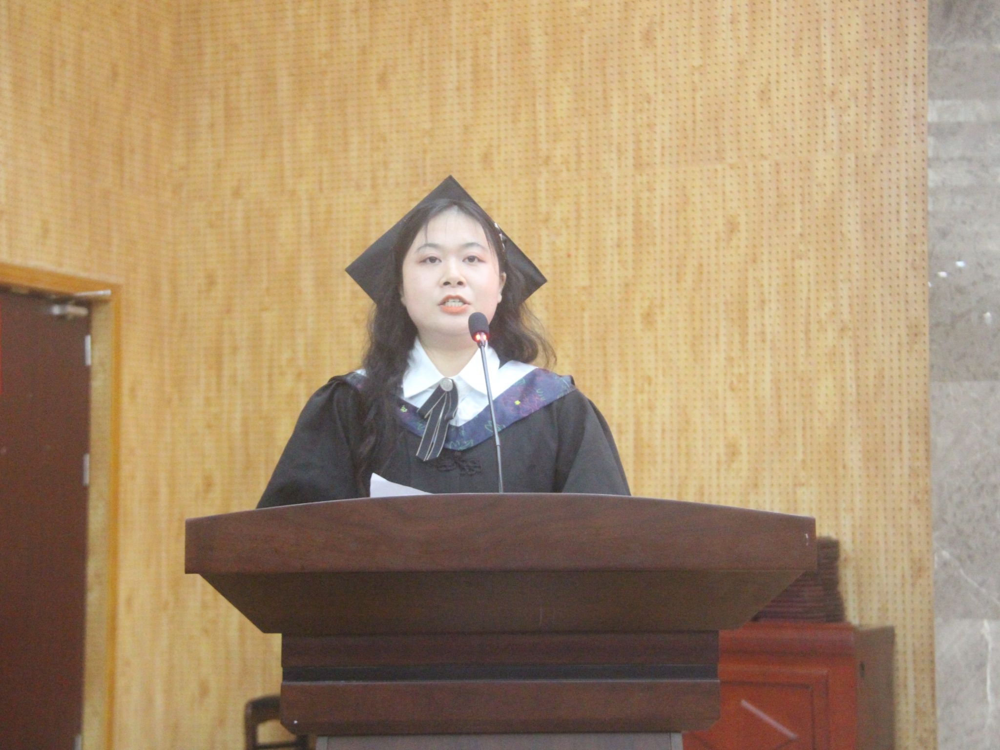 典礼开始前,大家共同观看了特别制作的满载回忆的视频和师生祝福短片。上午10点,典礼在庄严的国歌中正式拉开序幕,优秀毕业生代表徐磊同学、邵靖涵同学依次上台进行发言,他们对母校、学院以及老师多年的培养表示感谢,表达了对母校、学院的不舍之情以及对未来的美好期盼。毕业班班主任代表陶源泉老师在发言中回顾了同学们在校学习生活的点滴,并希望同学们不忘初心,带着大家的美好祝福,勇毅前行。该院黄在堂院长在致辞中希望毕业生们在未来的道路上怀揣梦想,扬帆起航,永远保持一颗敢于拼搏的心,书写属于自己的辉煌篇章。