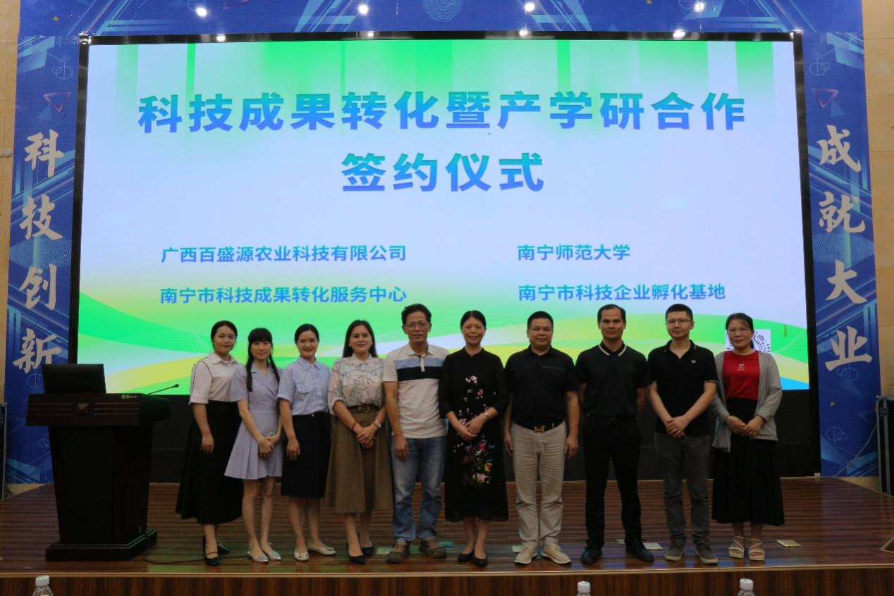 近日,我校与南宁市科技成果转化服务中心、广西百盛源农业科技有限公司在南宁市科技企业孵化基地共同举行了科技成果转化暨产学研合作签约及授牌仪式。我校环境与生命科学学院何英姿教授项目团队、广西百盛源农业科技有限公司、南宁市科技成果转化服务中心和南宁市科技企业孵化基地等单位代表出席。