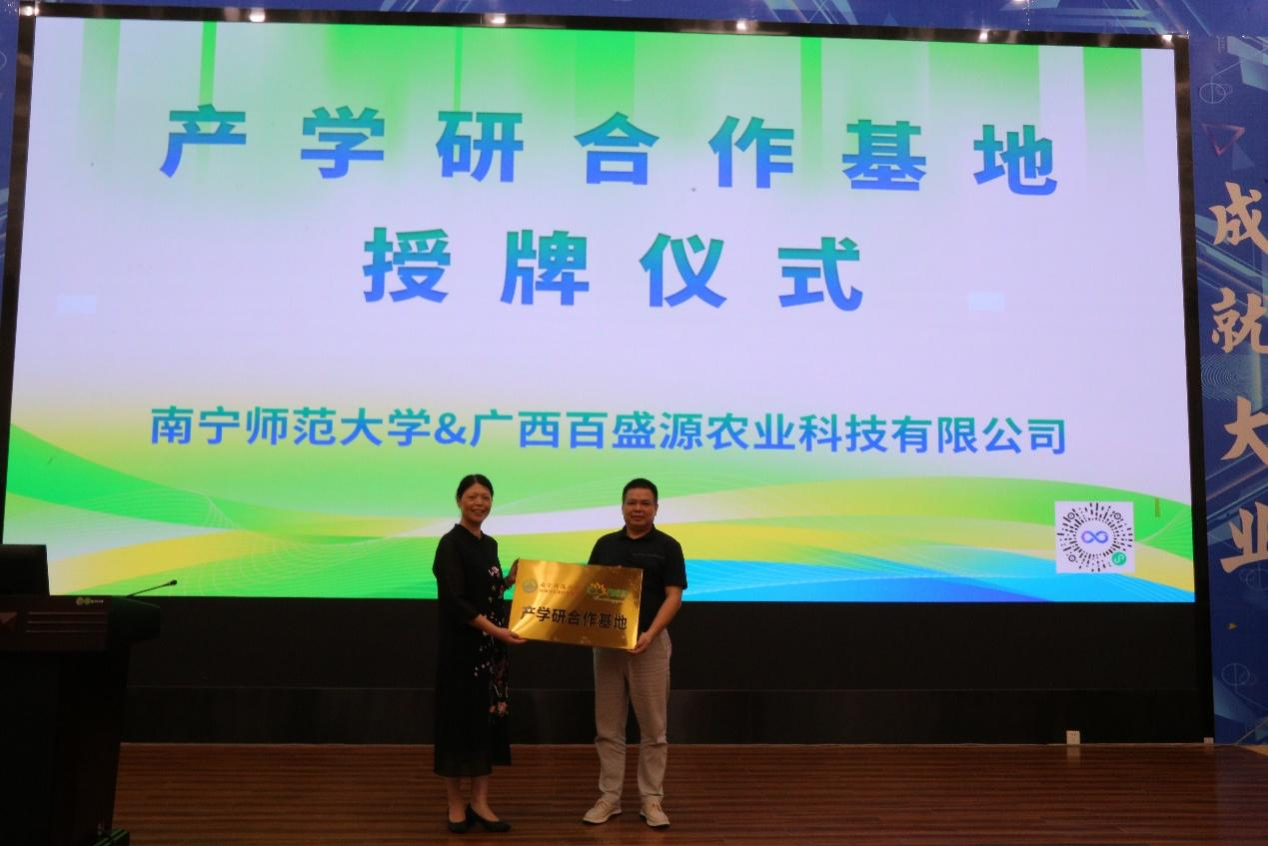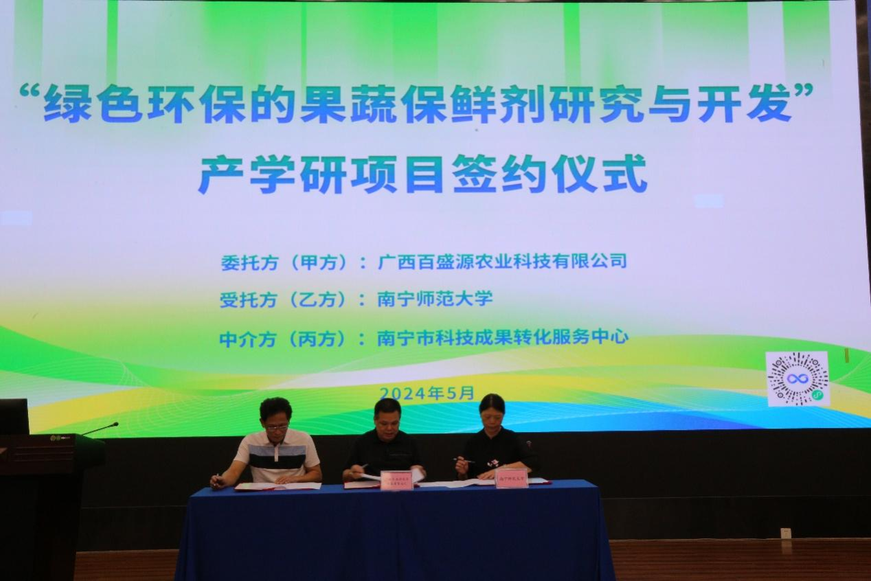 仪式上,何英姿教授与南宁市科技成果转化服务中心主任杨明慧和广西百盛源农业科技有限公司总经理韦庆文共同签署了“绿色环保的果蔬保鲜剂研究与开发”产学研项目合作协议。随后,何英姿教授与韦庆文总经理进行了产学研合作基地授牌。