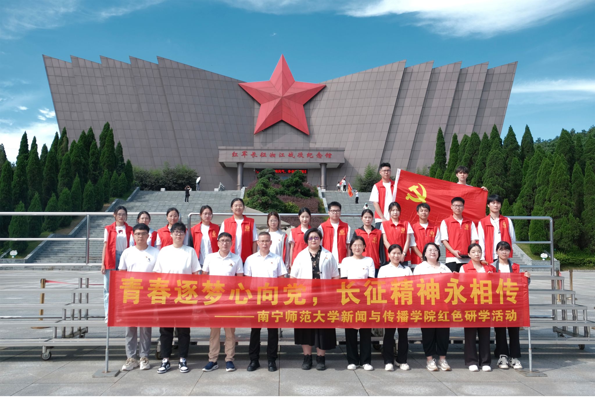 7月6日,新闻与传播学院红色研学团队举行本次“红色烽火 青春传承”主题研学活动开幕式。当天上午,在新闻与传播学院党委书记聂卉的带领下,师生们怀揣着对革命先烈的无限敬仰,来到了桂林市全州县红军长征湘江战役纪念馆开展红色研学活动。