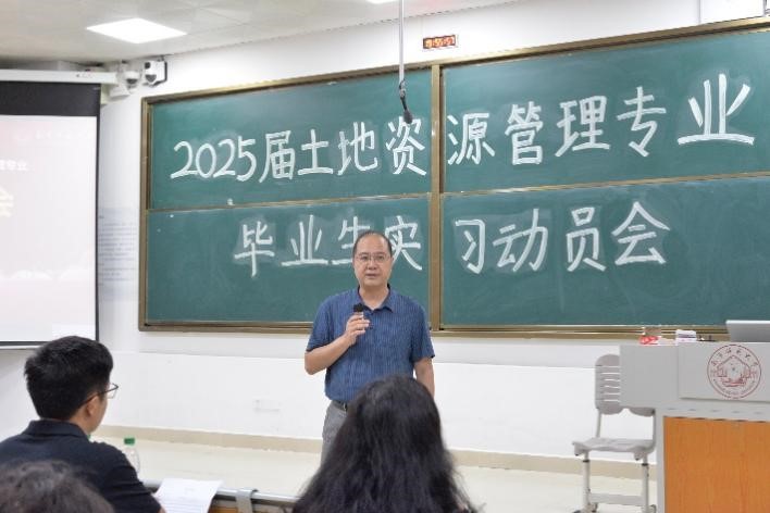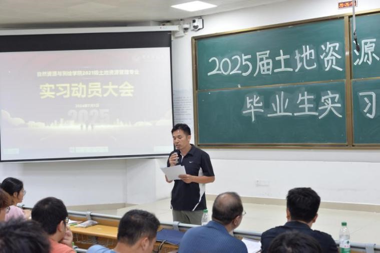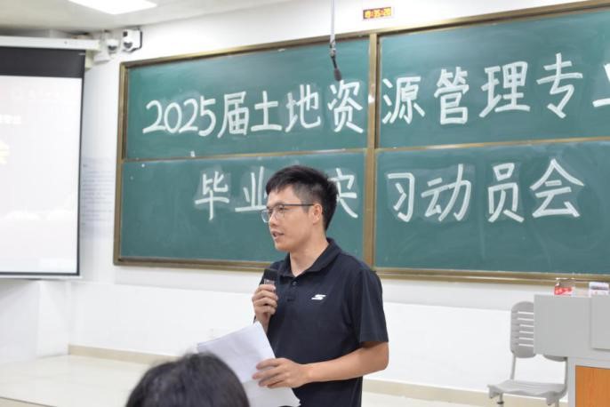 7月5日晚,自然资源与测绘学院土地资源管理系2025届毕业生实习动员大会在一号教学楼115阶梯教室举行。土管系党支部书记、系主任、副主任及教师代表,21土管1班、21土管2班级21土管专升本班141名同学参加,共同为即将踏上实习岗位的同学们精心筹备了一场别开生面的实习前动员大会,为2025届毕业生搭建起通往职场的坚实桥梁。