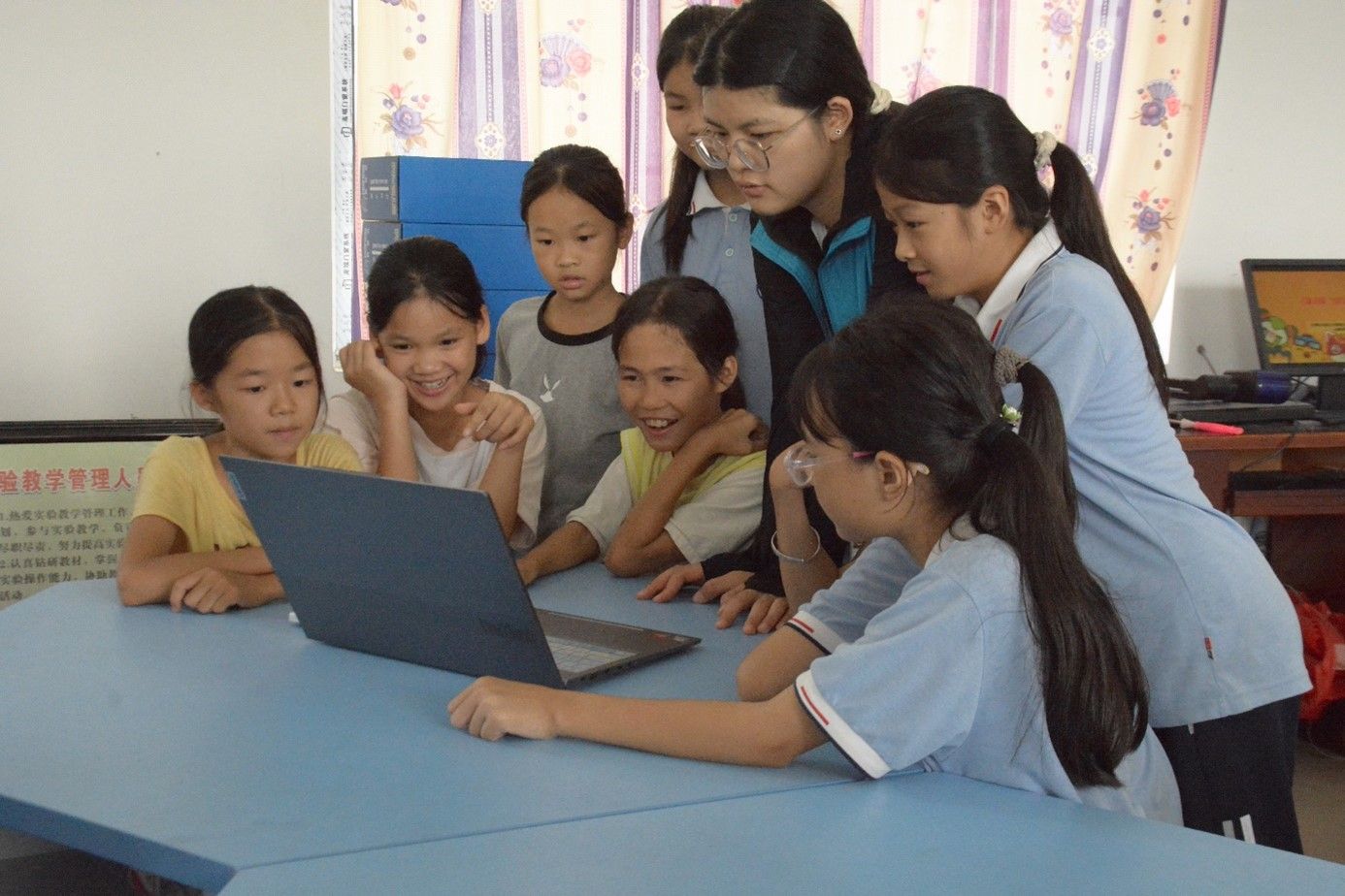 7月17日,计算机与信息工程学院/曙光大数据学院暑期“三下乡”“翔鹭”智汇民族实践团队在南宁市马山县林圩镇合理小学开展Codemao简单编程体验课。