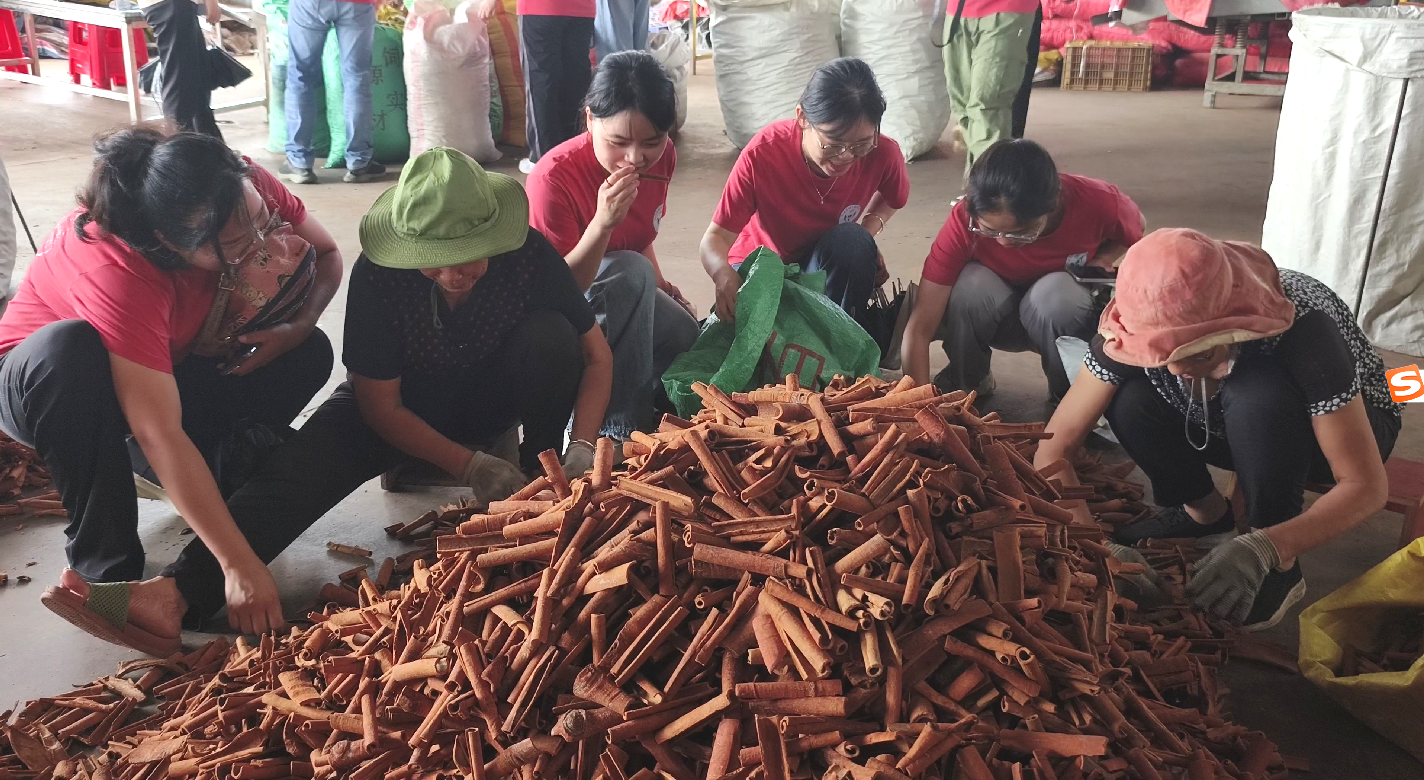实践团还深入扶隆镇民族团结产业基地、防城港市世杰香料有限公司、扶隆镇那果村育苗基地和防城区香料产业园区等进行实地调研。在防城港市世杰香料有限公司,大家观摩了八角与桂皮的分拣、晾晒、加工、运输、销售等一系列严谨有序的流程,详细了解如何辨别肉桂八角的品质优劣,并对香料行业产业链细节等进行了考察;在育苗基地,实践团深入了解了肉桂八角的种植历史、育苗过程、销售情况等;在香料产业园区,实践团对香料产业规划设计做了深入地调研分析,就智能立库设计、信息化建设、节能环保措施等展开讨论并提出专业的方案构思。