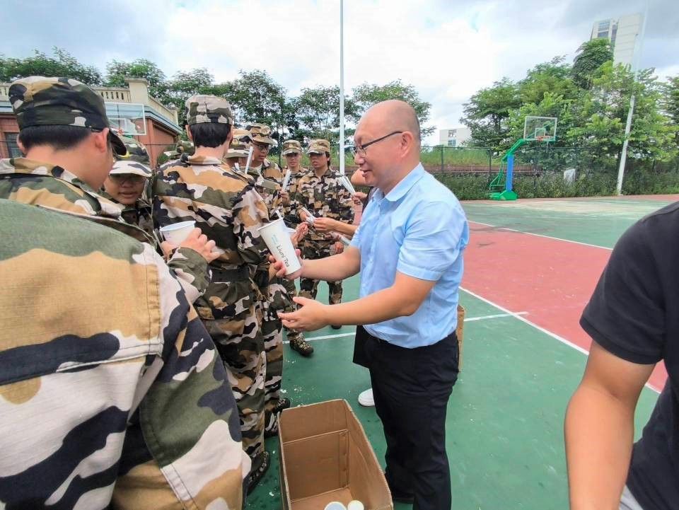 黎先代表学院向军训的同学们表达了关心和慰问。他表示,同学们在军训中磨炼自己的意志,展现了良好的精神风貌,希望同学们能够认真训练,圆满完成军训任务;同时叮嘱大家在军训期间要注意合理安排作息时间,注意劳逸结合,做好防暑降温措施,照顾好自己,做好确保身体健康和安全。