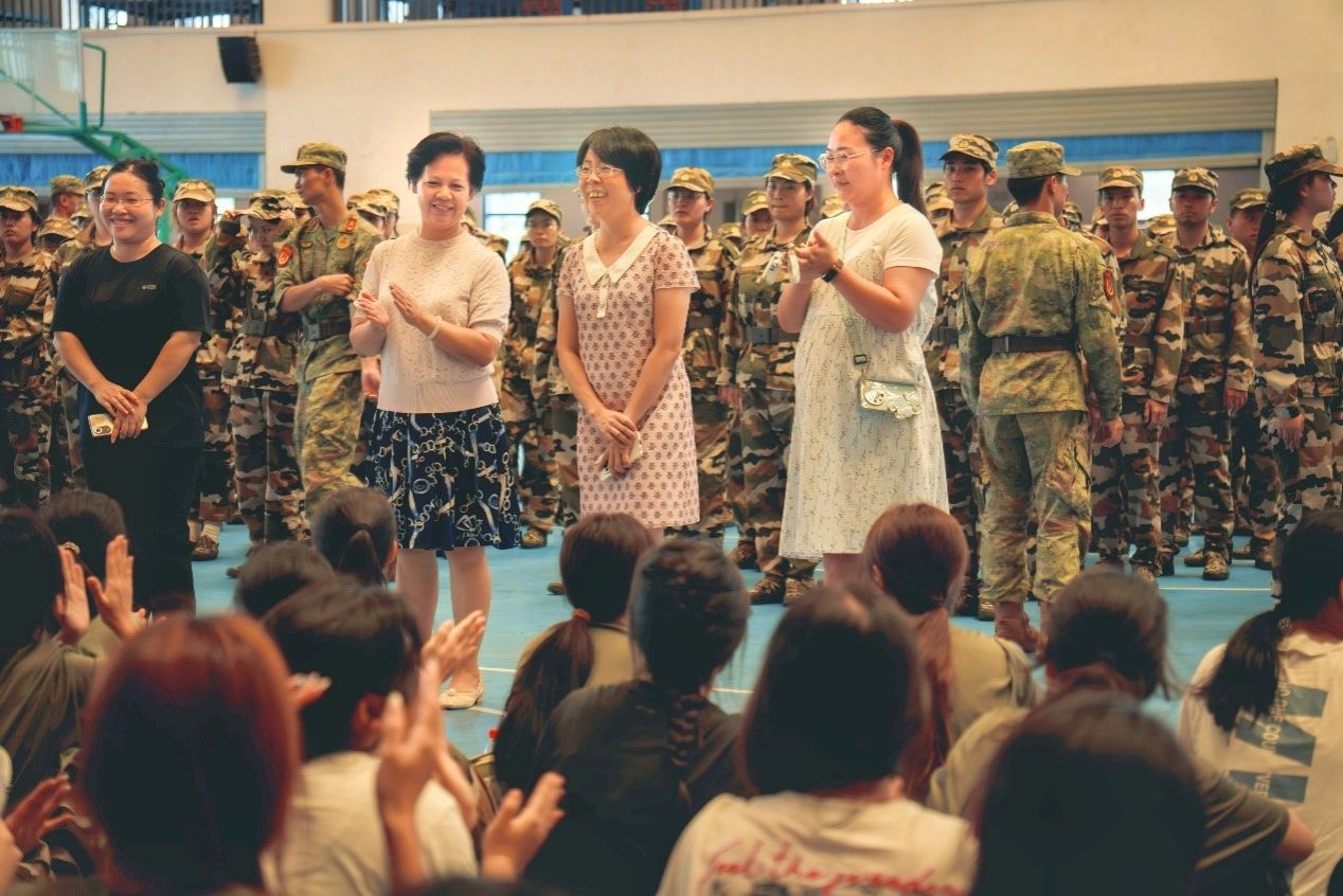 为了解学生军训情况,提高学生军训的士气,7月14日上午,职业技术师范学院党委书记李穗、副院长蓝洁率队到五合校区体育馆慰问2023级全体本科生及教官。