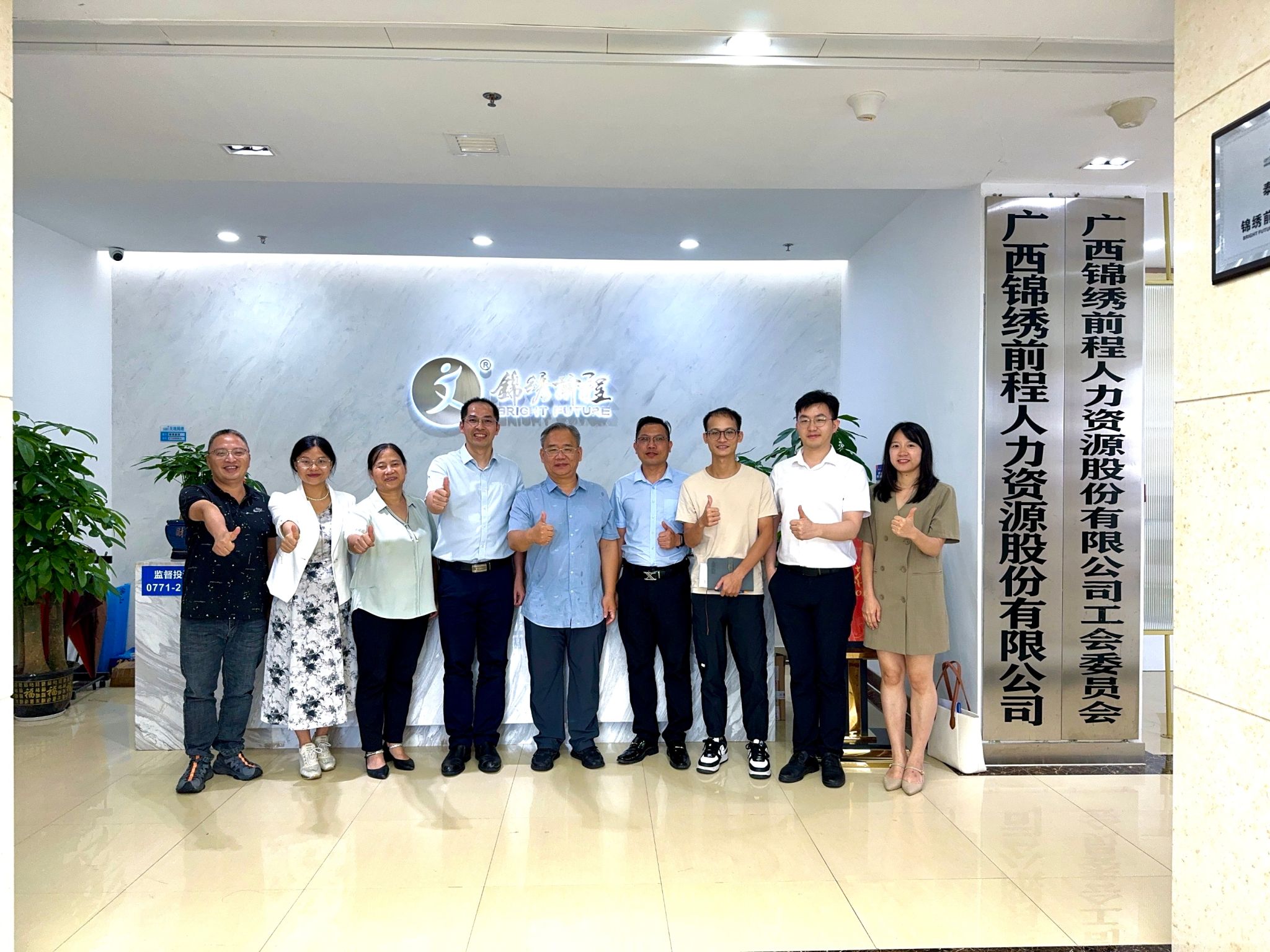 在广西锦绣前程人力资源股份有限公司,经济与管理学院党委书记韦海鸣、党委副书记何一飞,物流管理与工程学院党委书记陈兵、党委副书记黄宇,旅游与文化学院党委副书记黄珍等联合开展了访企拓岗活动,与学院优秀校友、公司副总经理、董事会秘书黄宗勇等开展了座谈会,双方就经济社会对于人才需求的变化趋势进行了探讨,就进一步加强党建领域合作、大学生就业能力提升等进行交流。双方还聚焦2024届毕业生就业冲刺期,就如何结合学院毕业生专业背景、就业意向等,发挥公司业务背景、资源优势助力学院毕业生就业进行了深入研究。