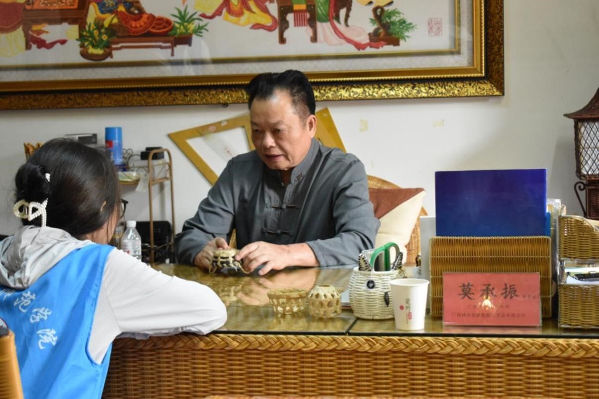 在博白县团委的带领下,实践团队拜访了莫承振大师工作室,聆听了自治区级非遗项目芒竹编织技艺传承人莫承振大师关于芒编的悠久历史、编织技法及其独特美学价值的讲解,实践团深切体会到了芒编工艺中所蕴含的文化底蕴与传承匠心。
