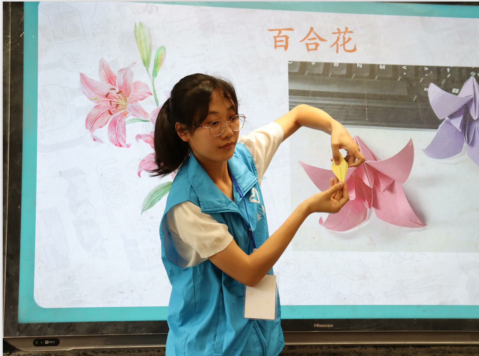 在化学实验课上,志愿者以“手工滴胶”的课程内容为切入点,塑造出科学与手工相结合之美,激发小朋友们对化学实验、探索世界奥妙的兴趣。随后,志愿者演示了“神奇水”实验,引导小朋友们观察烧杯中溶液颜色变化的奇妙过程。紧接着,志愿者邀请小朋友们上台协助演示实验,使小朋友们感受到了化学反应的魅力。而当课堂逐渐推向高潮时,志愿者更是施展出“火云掌”绝技,以一系列酷炫而精彩的姿势,将这节化学实验课演绎得既震撼又充满乐趣。