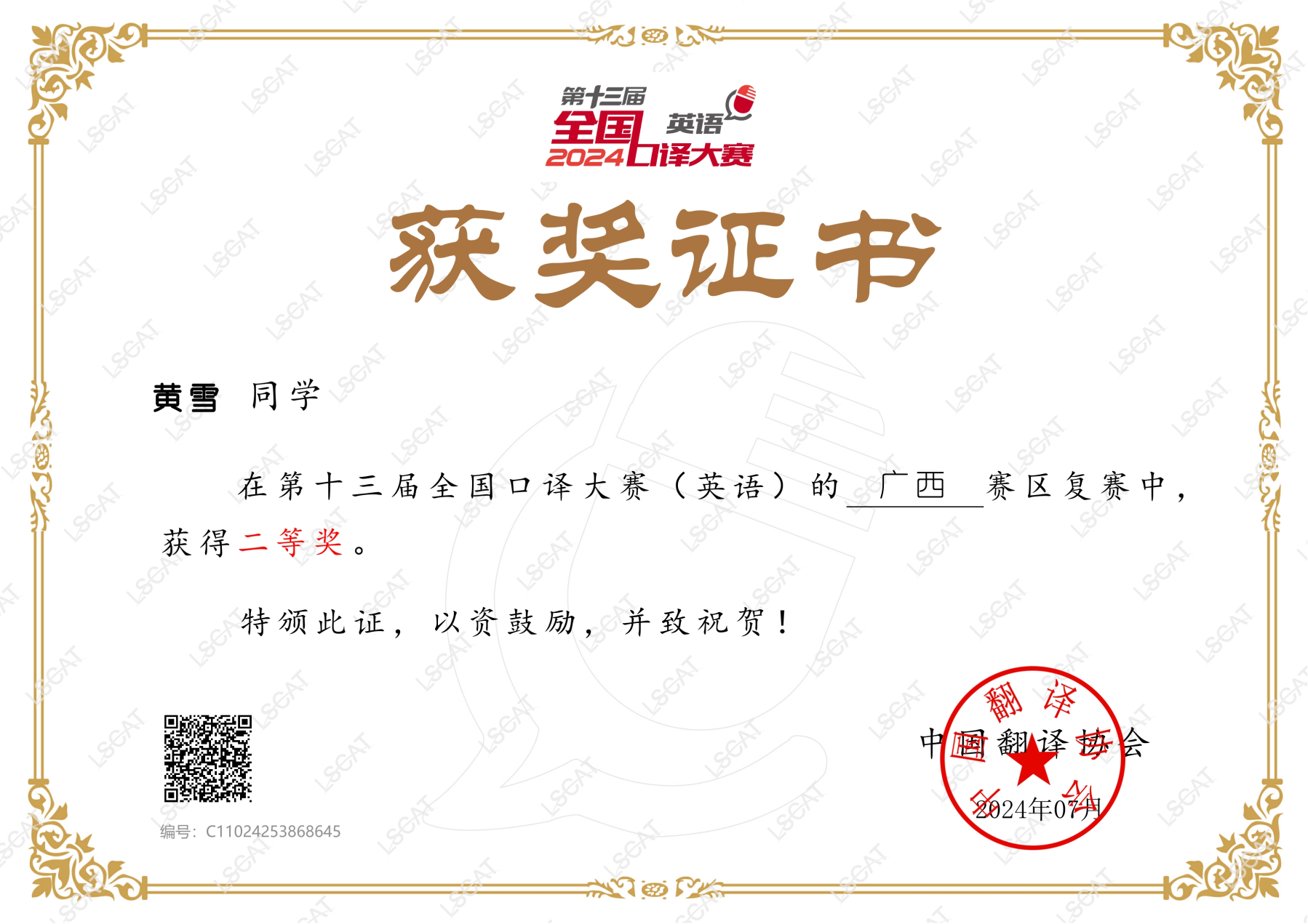在6月22日至23日通过线上平台成功举行的第十三届全国口译大赛(英语)广西赛区复赛中,我校外国语学院的学生们以出色的表现取得优异成绩。2020级翻译专业李果芙同学和2022级英语语言文学专业黄雪同学荣获二等奖,2022级英语语言文学专业尚武卉同学荣获三等奖。