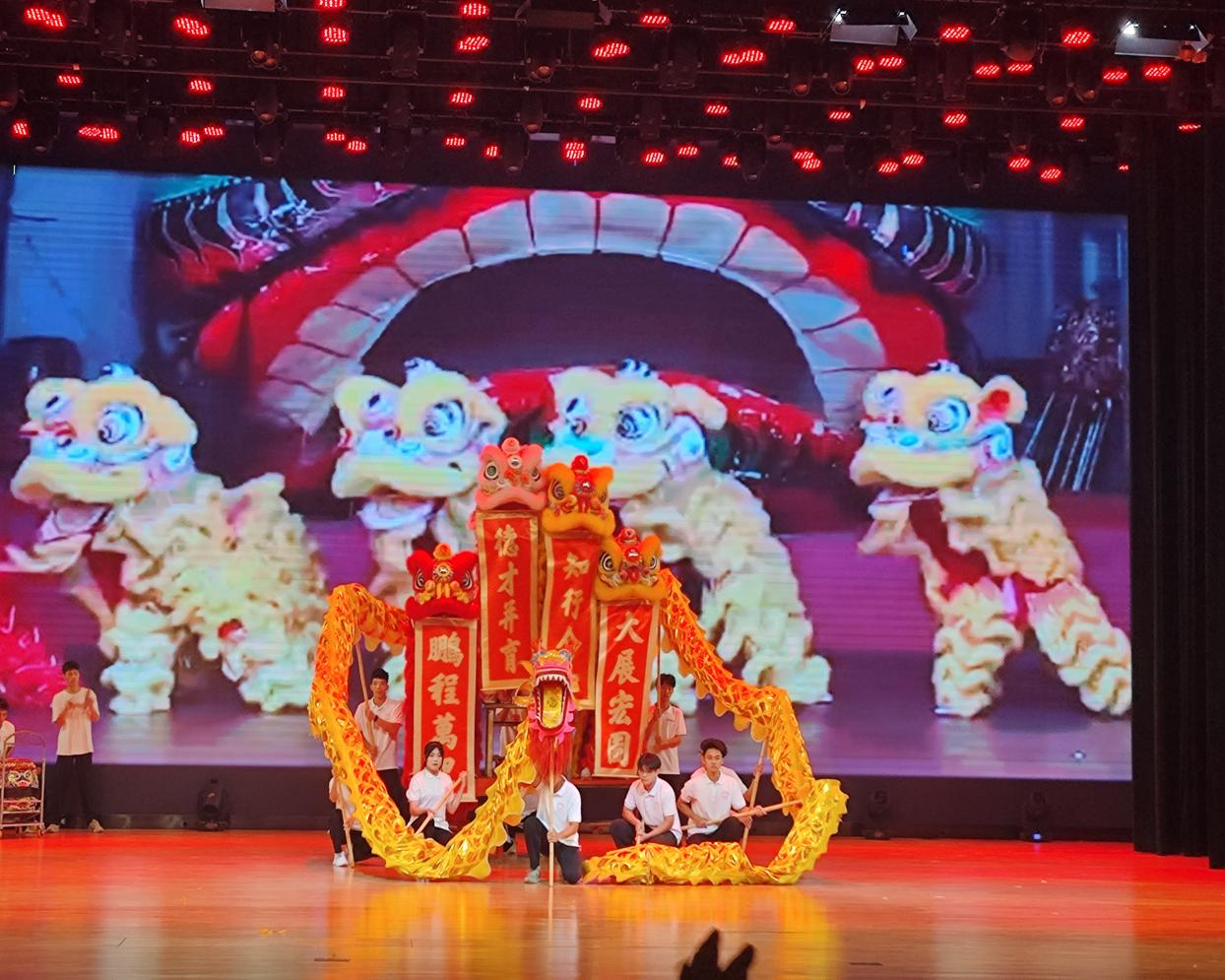 晚会伊始,由法学与社会学院龙狮团献上节目《醒狮登山送祝福,恩师情深似云天》。伴随着气势磅礴的鼓声响起,一条威风凛凛的东方巨龙和四只瑞兽盘旋登场,舞龙舞狮的队员踩着高低起伏的鼓点,配合龙狮团队员们的动作,东方巨龙时而翻腾,时而耸立,时而穿梭,时而飞跃,呈现出不同的瑞兽神态,龙的霸气展现得淋漓尽致。在场的观众聆听鼓乐齐鸣,悦享龙狮盛宴。