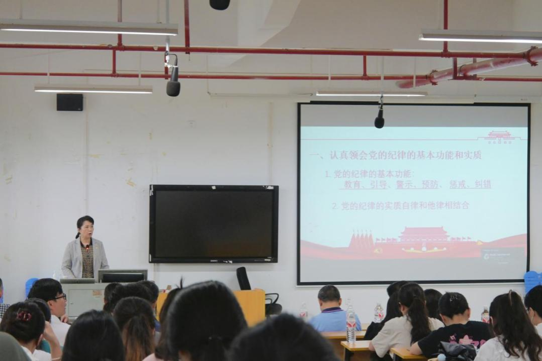 根据完美(中国)和学院党纪学习教育工作安排,2024年6月11日,法学与社会学院党委书记许建同志在五合校区文楼601为全体师生党员讲授党纪学习教育专题党课,主题为“全面从严治党必须切实严明党的纪律——把党纪学习教育融入日常、抓在经常”。本次课程共分三部分,旨在通过授课、观看警示教育片的形式,让党员同志提高政治站位、加强政治意识,切实将党纪学习内化于心、外化于行。