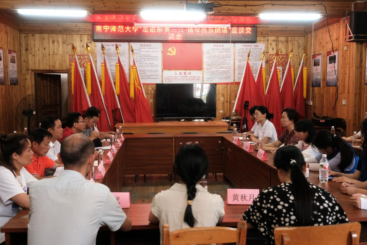 为深入贯彻党的二十大精神,加强民族团结进步创建工作,共同探索乡村可持续发展的新路径,2024年7月17日上午,南宁师范大学法学与社会学院“三下乡”社会实践团队在柳州市三江侗族自治县独峒镇平流村党群服务中心会议室,成功举办了以“共绘乡村新蓝图,携手铸牢民族团结”为主题的座谈会。南宁师范大学法学与社会学院党委书记许建、“三下乡”社会实践团全体成员、平流村村两委干部、村小学教师代表、村民代表参加了本次座谈会。会议由平流村驻村第一书记张祥勇主持。
