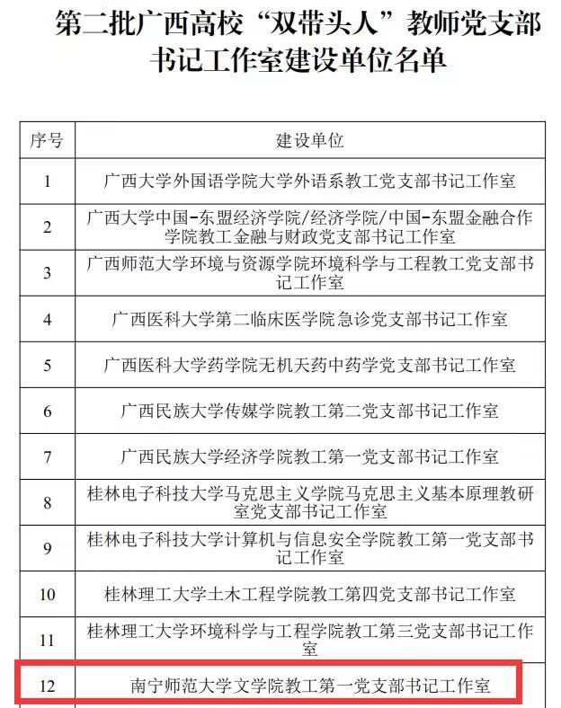 近日,自治区党委教育工委公布了第二批广西高校“双带头人”教师党支部书记工作室建设单位名单,文学院教工第一党支部书记工作室荣列其中。