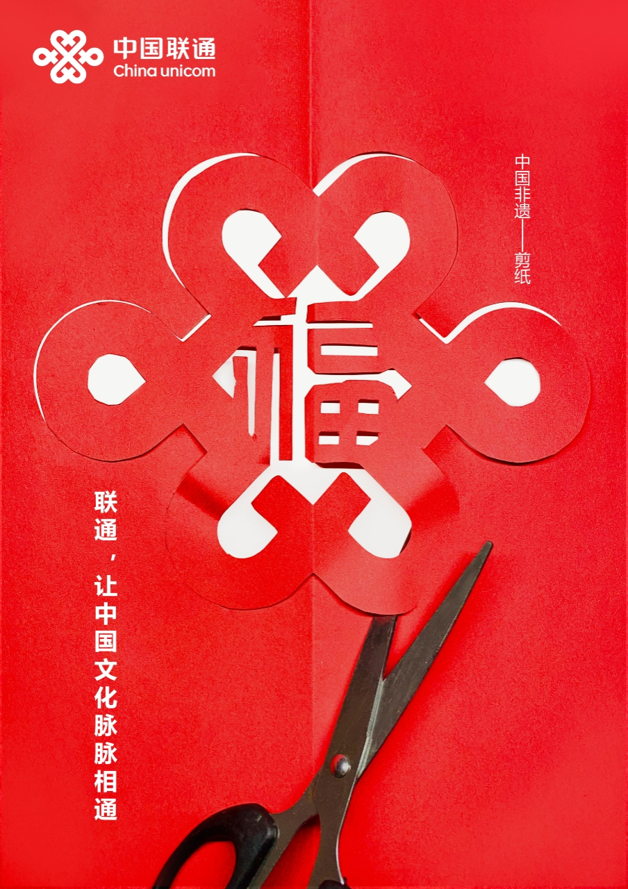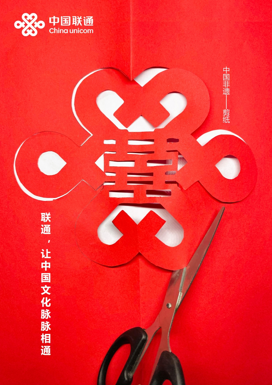 《联通,让中国文化脉脉相通》是黄彬婷同学在广告系教师宋丽丽的指导下创作的平面类作品。该作品以剪纸的形式巧妙地将双喜字、福字、春字与中国联通LOGO融为一体。这不仅有助于提升中国联通的品牌形象和市场竞争力,更弘扬了中国非遗剪纸艺术,促进了中国传统文化的传承和发展。