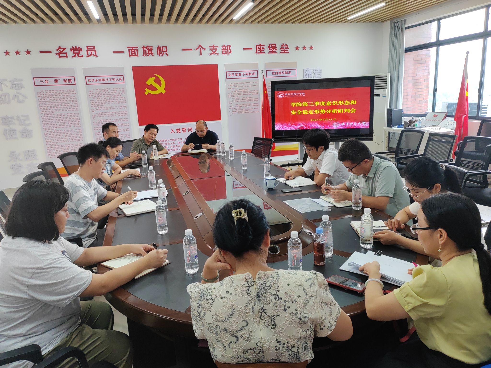 会议强调,要守好意识形态和安全稳定的主阵地,坚持正确的舆论导向,弘扬主旋律,宣传正能量,严格执行“三审三校”制度,确保信息报道规范。要深入学习贯彻党的二十届三中全会精神,大力弘扬教育家精神,扎实落实立德树人根本任务,坚持为党育人、为国育才,切实落实落细各项工作举措。切实增强底线思维,抓实安全工作,筑牢安全屏障,构建平安学院。